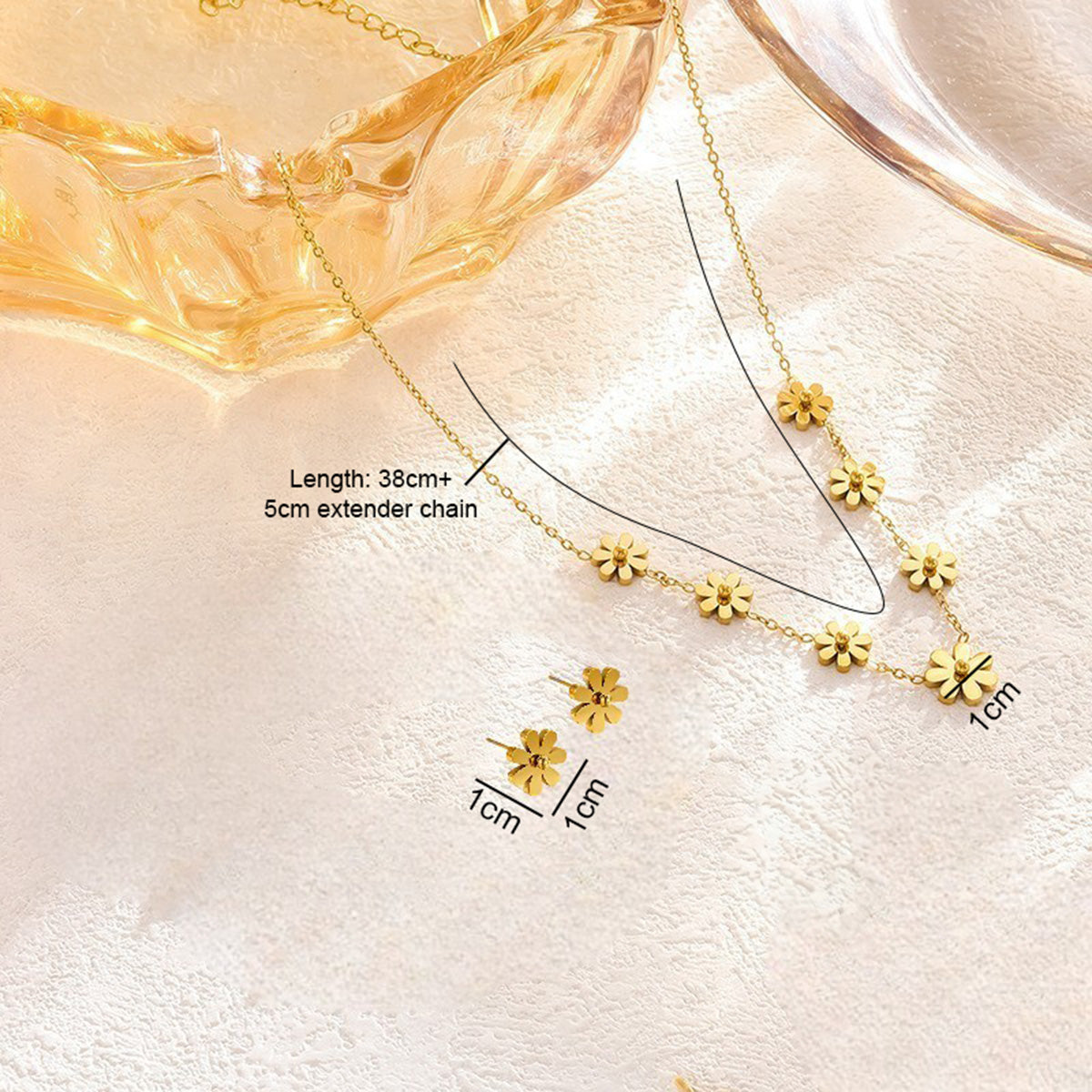 - Length of Necklace: 40cm + 4.5cm extender chain, Length of earring:1 cm, width: 1cm