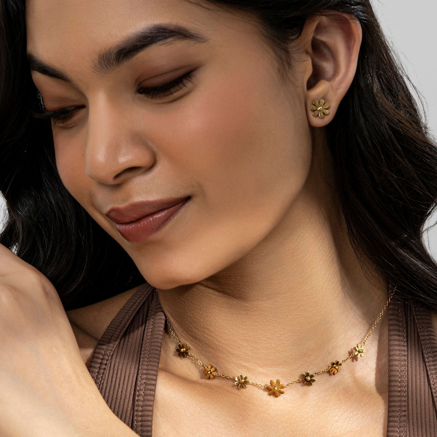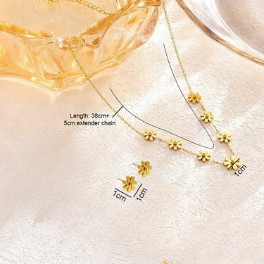 A dainty and feminine necklace set adorned with delicate floral charm design for a graceful look. It's a stunning piece of flower jewelry. The high polish metal surface gives a premium look.