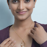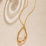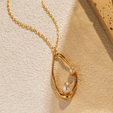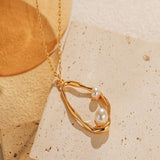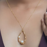 A graceful and timeless pearl pendant necklace within an elegant abstract oval frame.