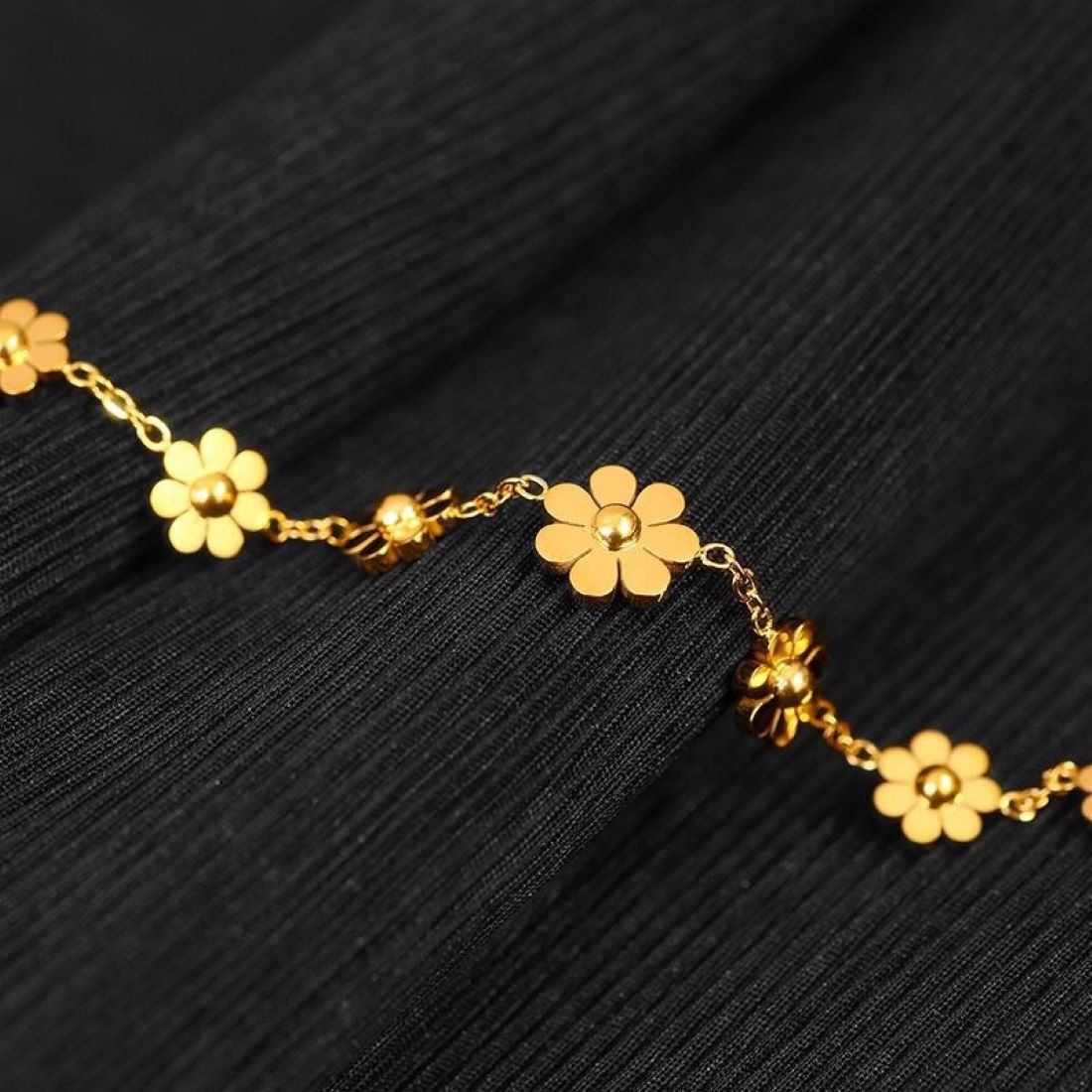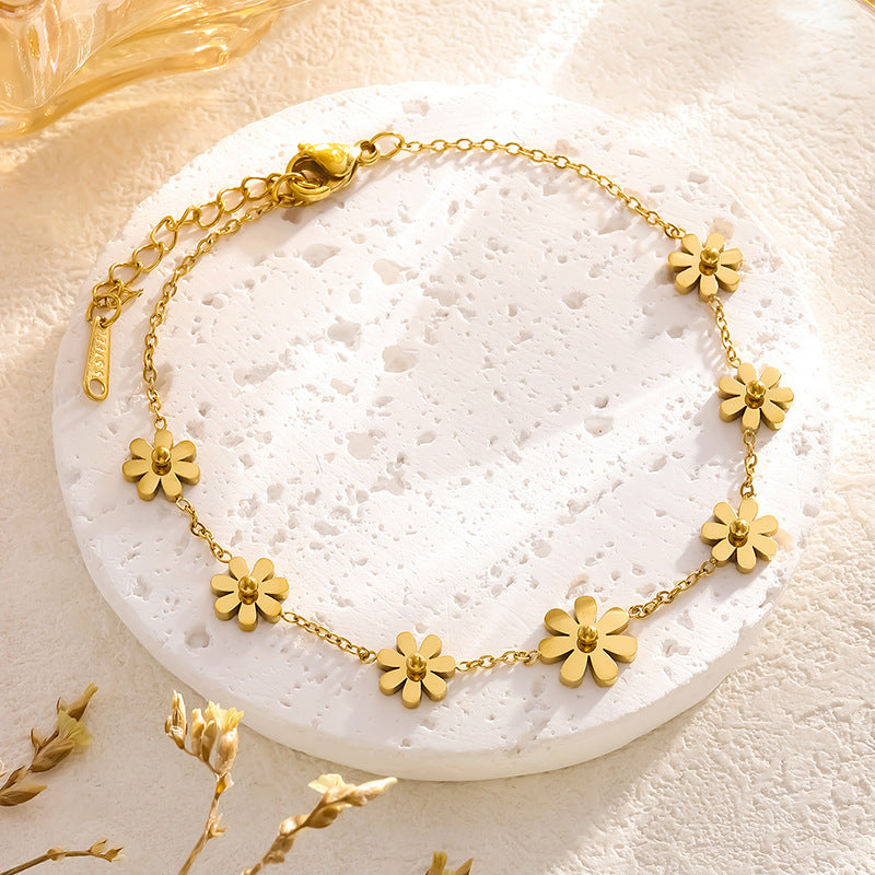 A dainty and feminine anklet adorned with delicate floral charm design for a graceful look. It's a stunning piece of flower jewelry. The high polish metal surface gives a premium look.