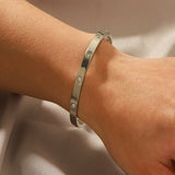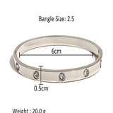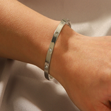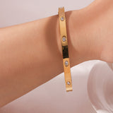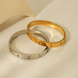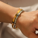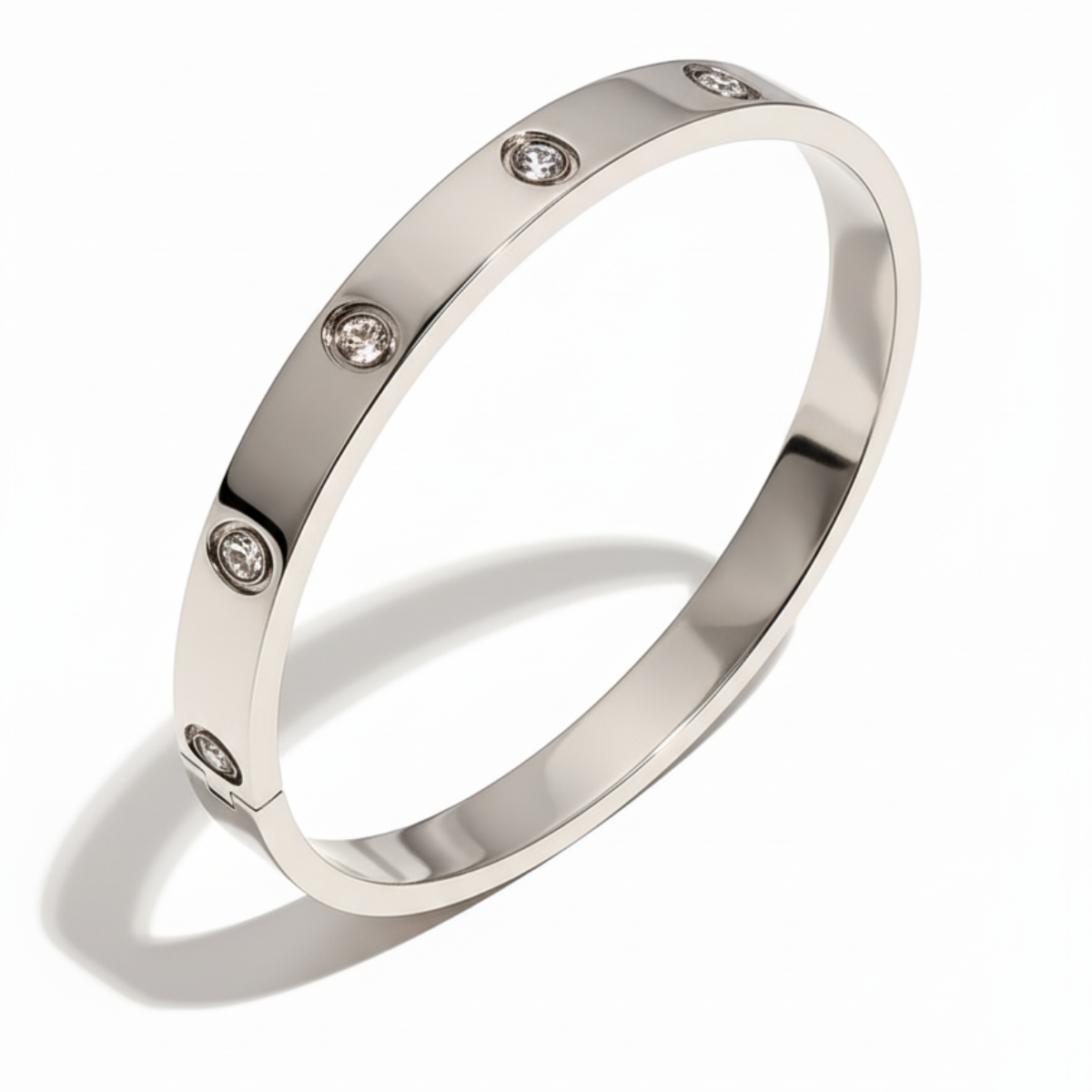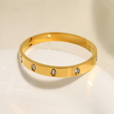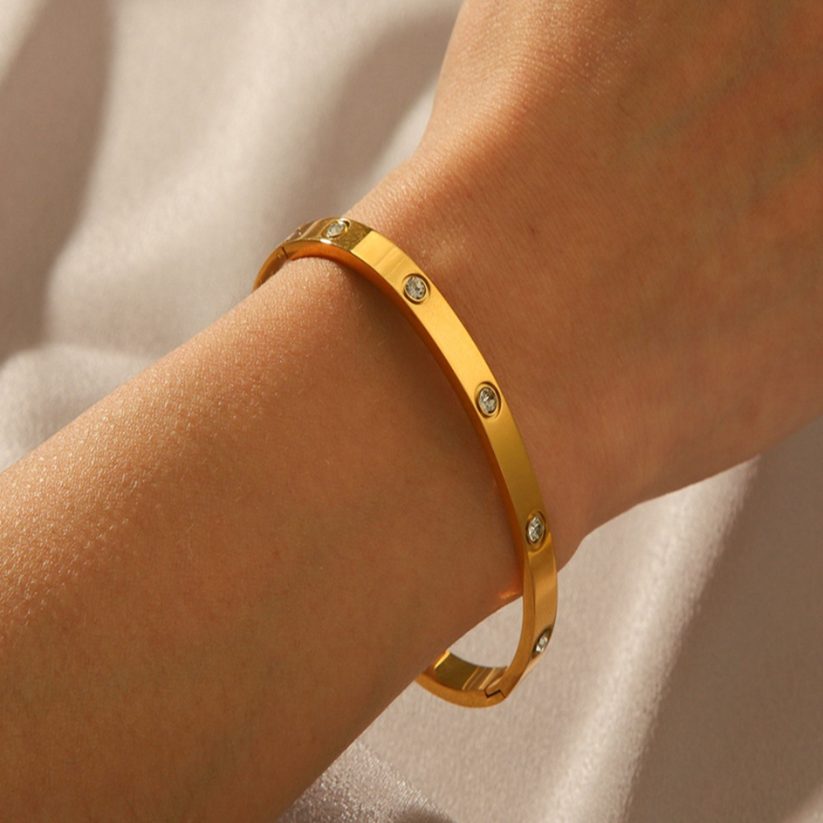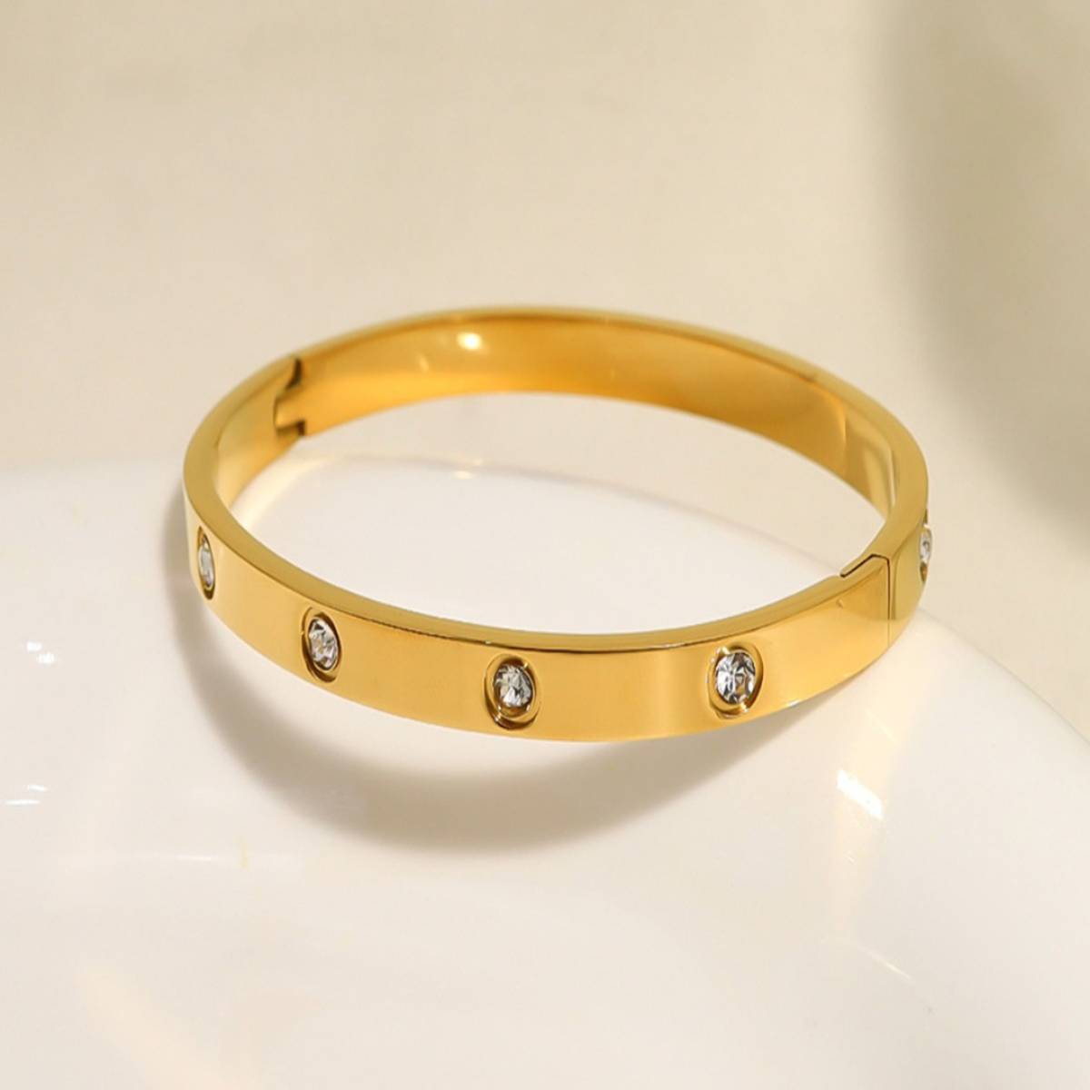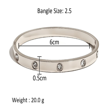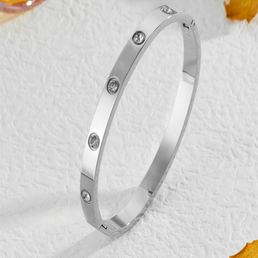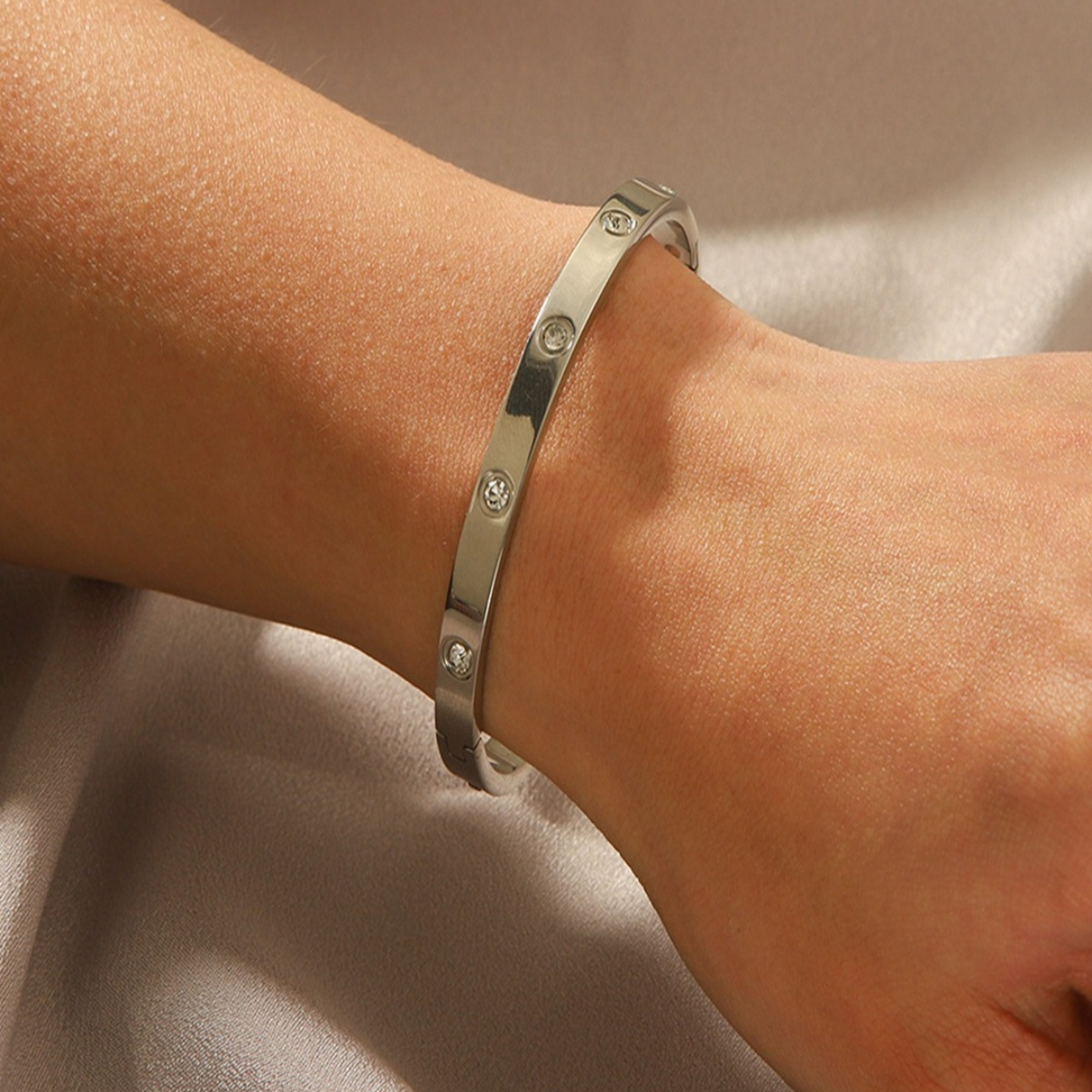 A timeless and elegant open bangle bracelet with sparkling white round shaped zircon stones.