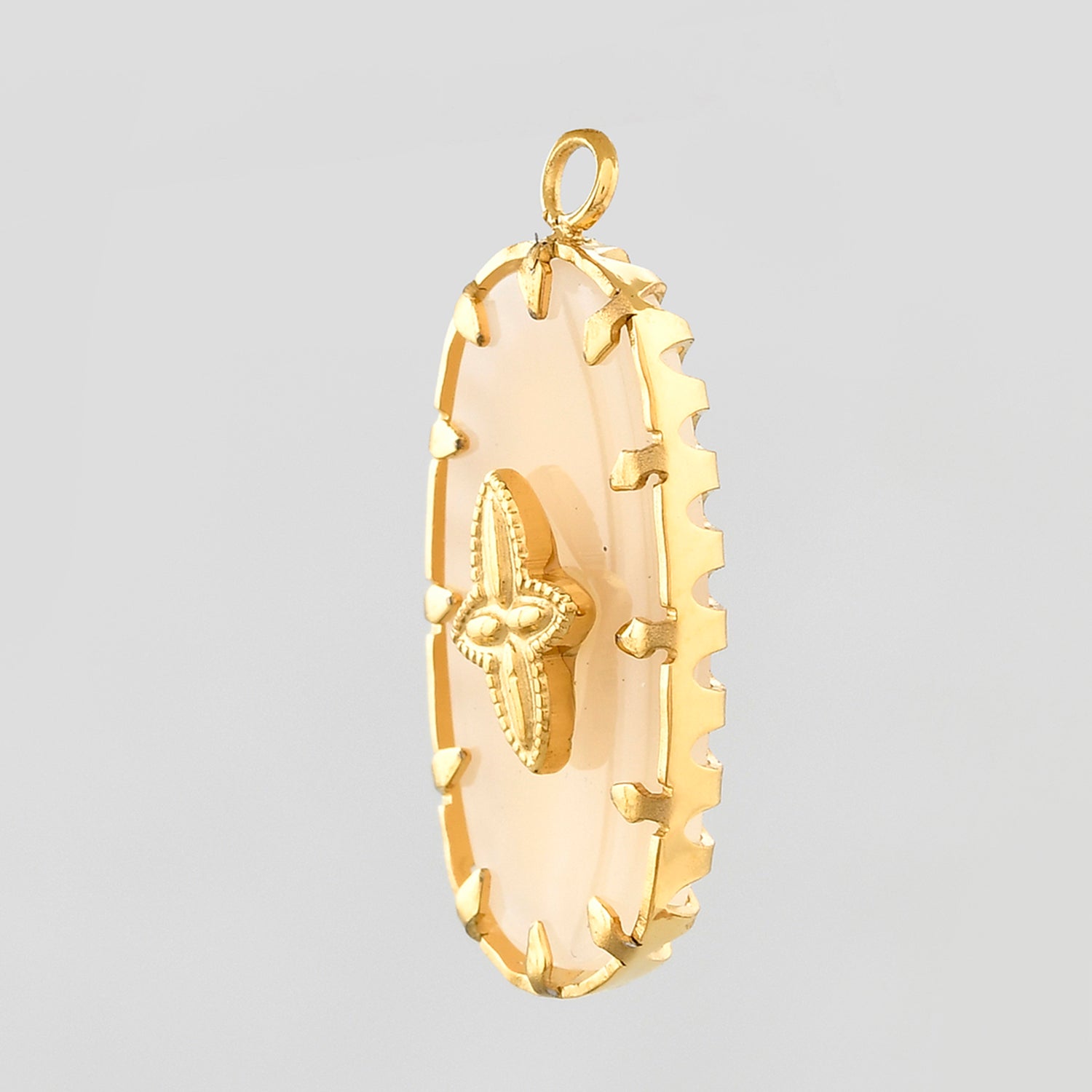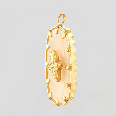 This beige charm locket features an 18K gold-plated frame, designed for durability and long-lasting beauty. It is also customizable, allowing you to select your preferred pendant and pair it with the chain of your choice.