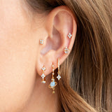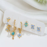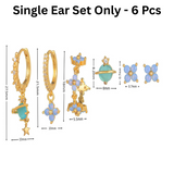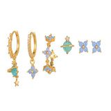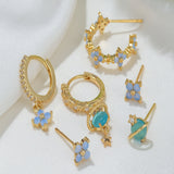This curated earring set (for SINGLE EAR ONLY) brings together dainty florals, clover, a planet charm and shimmering stones. Each piece is crafted in high-polish gold toned 18k gold, accented with aqua enamel and zircon brilliance. Perfect for creating a magical ear party or styling solo for a subtle celestial vibe."