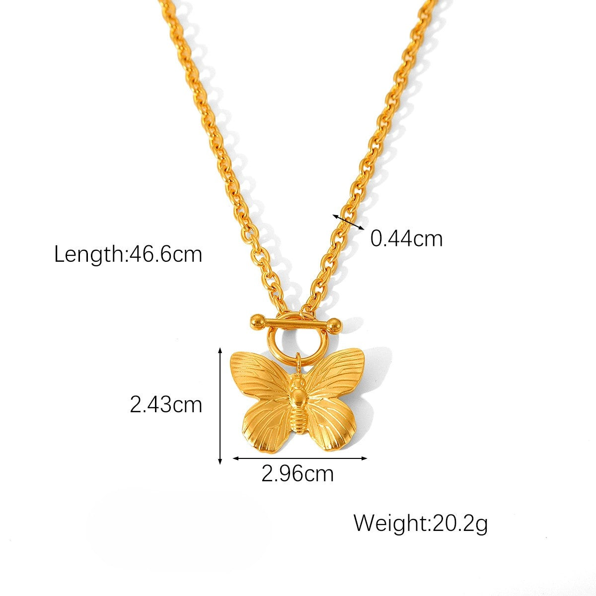 - Length of necklace: 46.6cm, width: 0.4cm, butterfly: 2.4x2.9cm