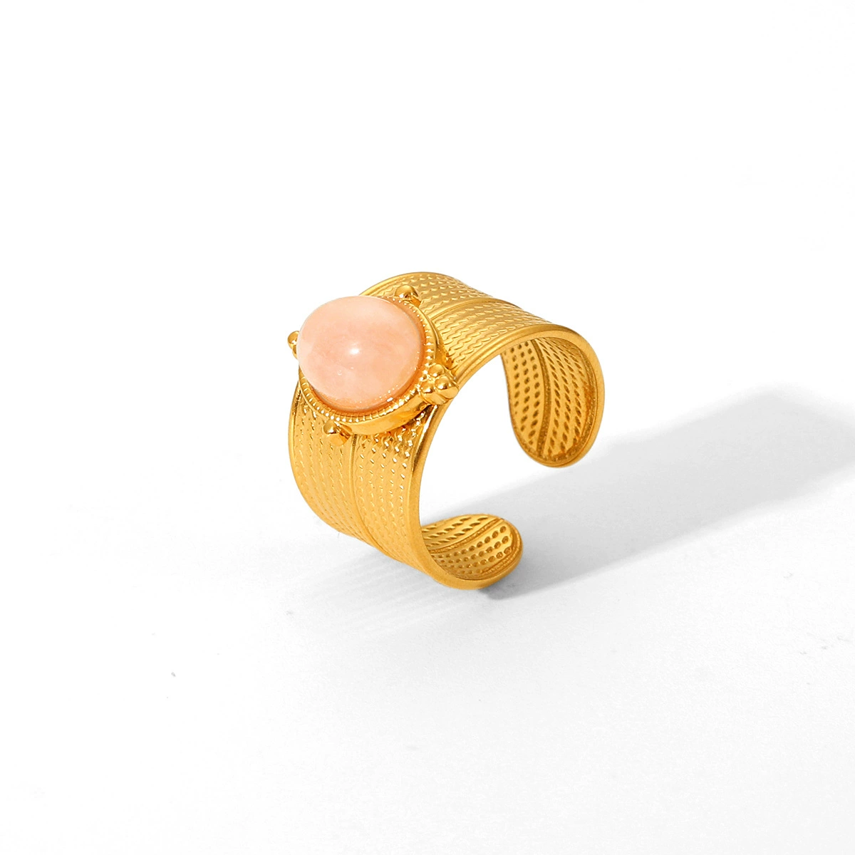 Elevate your style with the Aurelia Moonstone Ring. Featuring a glowing pink moonstone atop a wide, textured gold band, this open adjustable ring combines comfort with intricate detailing for a sophisticated look. A perfect fusion of timeless charm and modern elegance for any occasion.