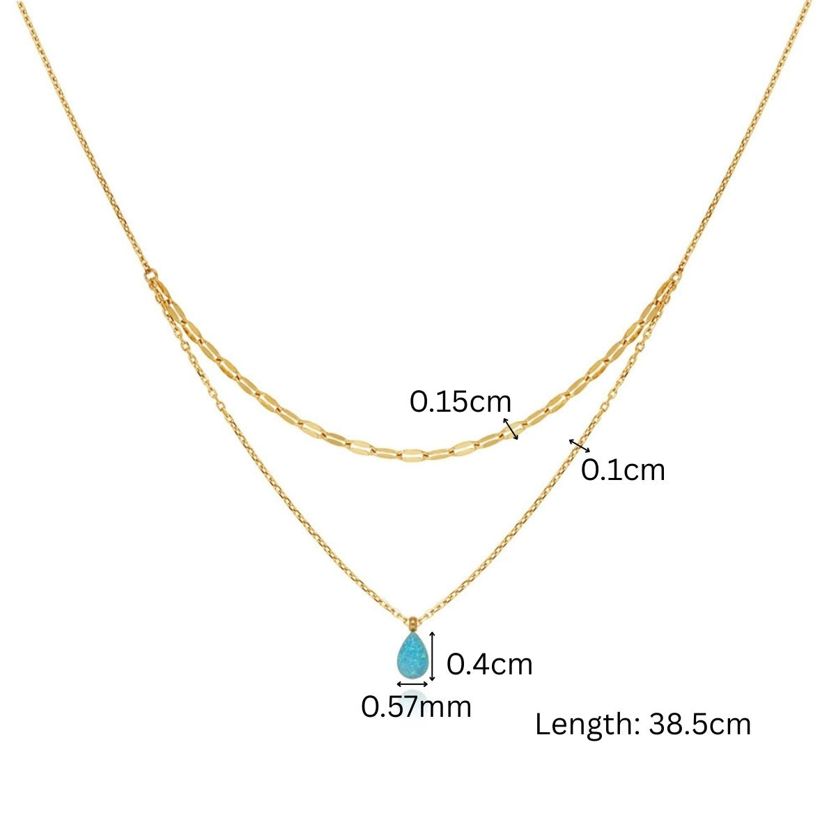 - Chain 1: Length: 38.5cm, Width: 0.1cm, : 0.15cm Pendant: Length:0.4cm, Width: 0.57m