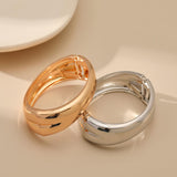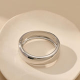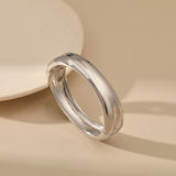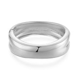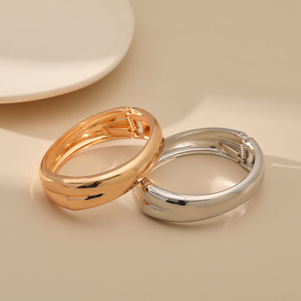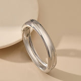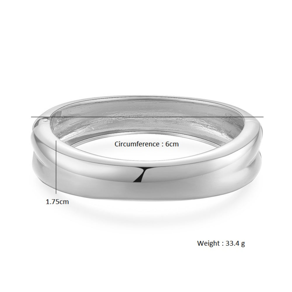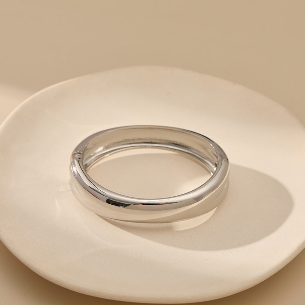 This bracelet features a round silver glossy finish with a geometric design and an openable clasp, offering a modern and versatile accessory for any outfit.