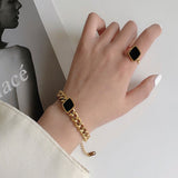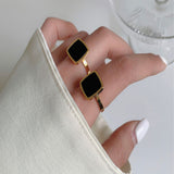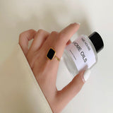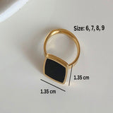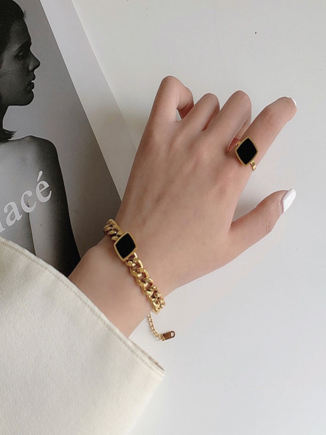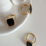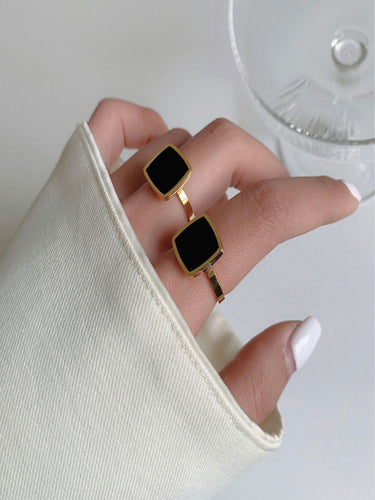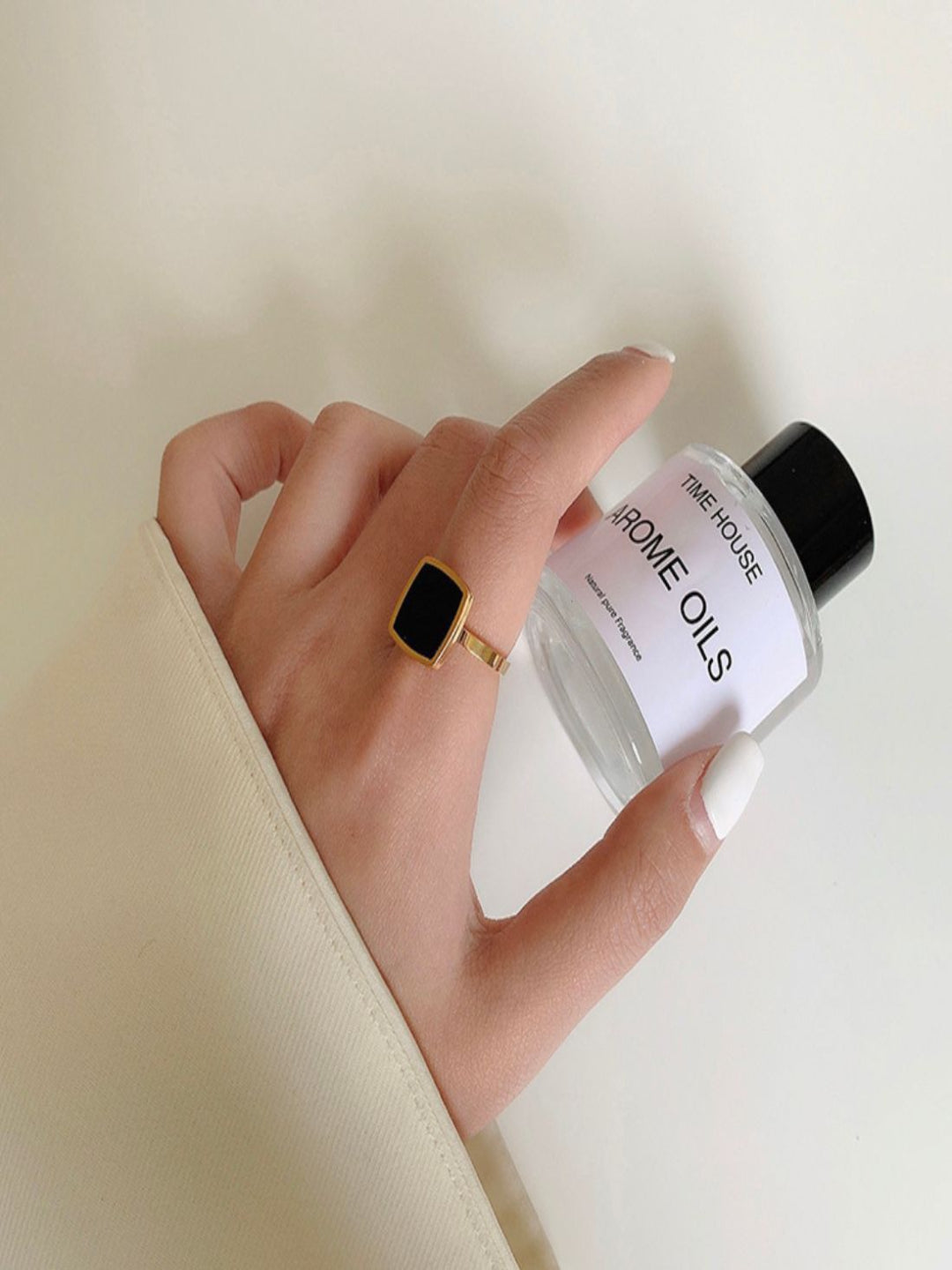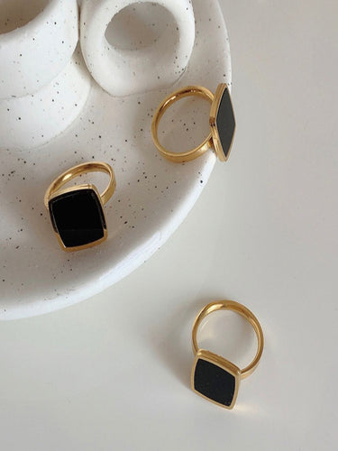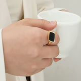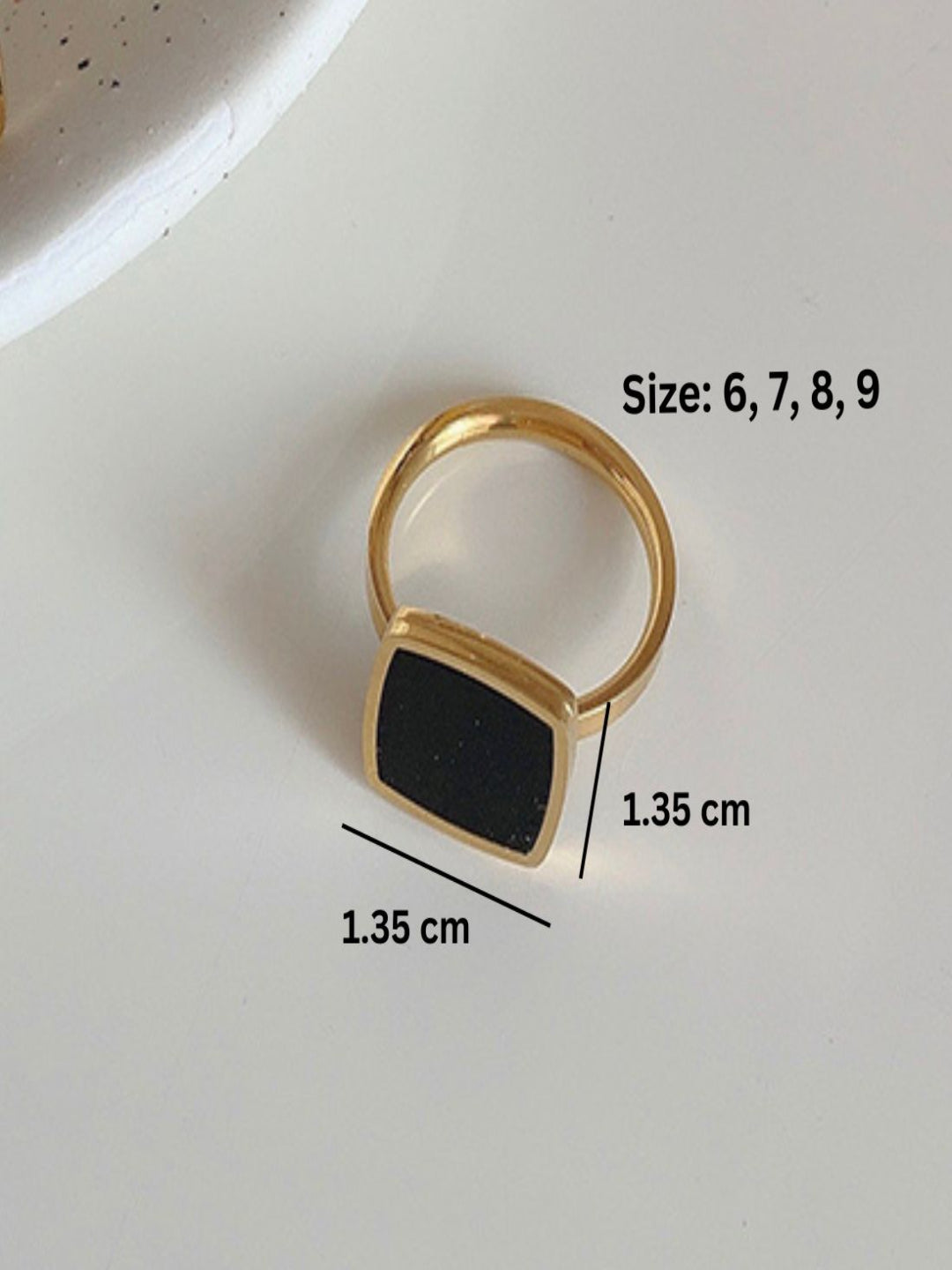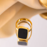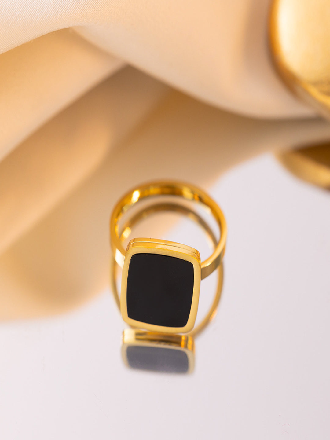 This 18K gold-plated ring features a sleek black onyx on a polished titanium steel band, blending minimalist elegance with lasting durability.