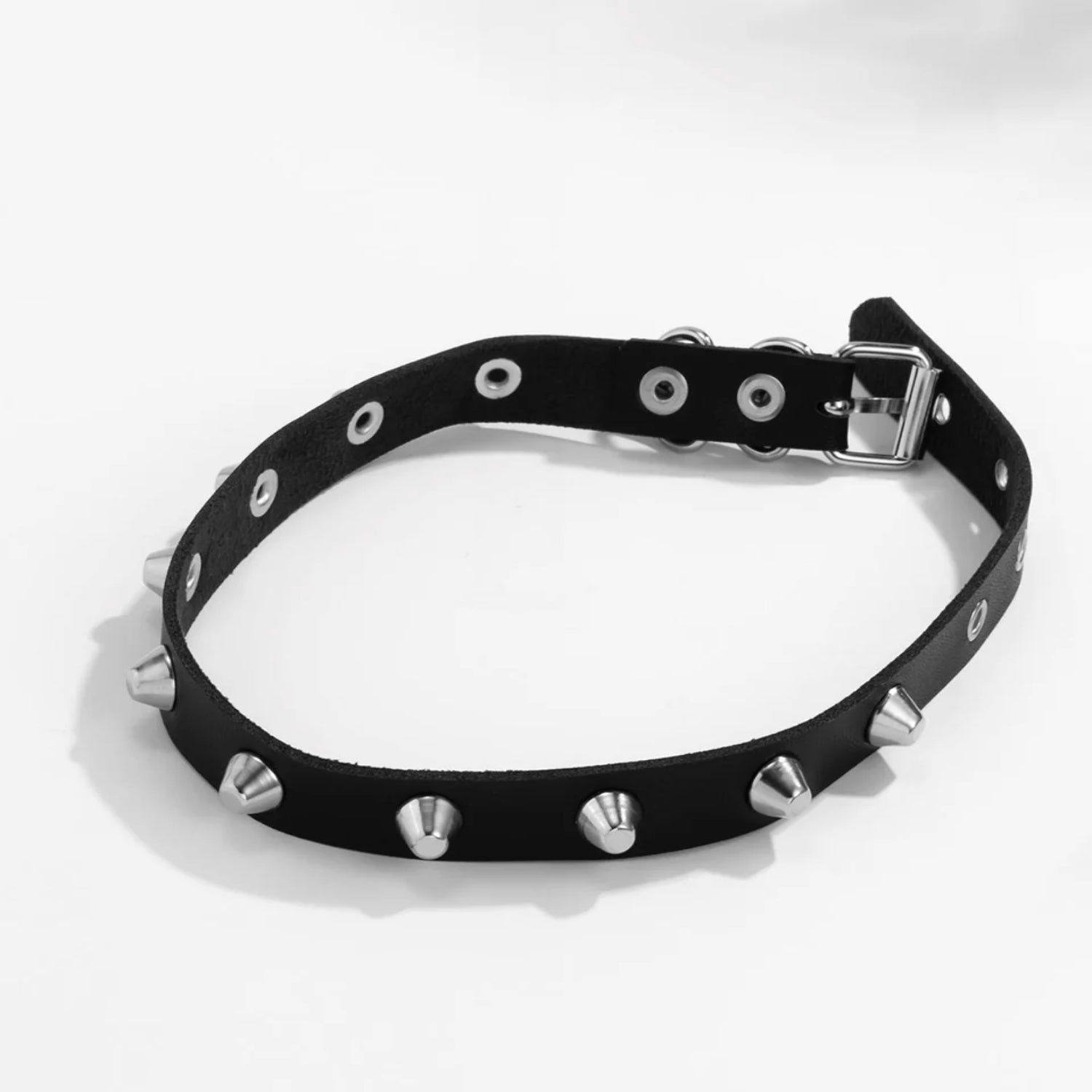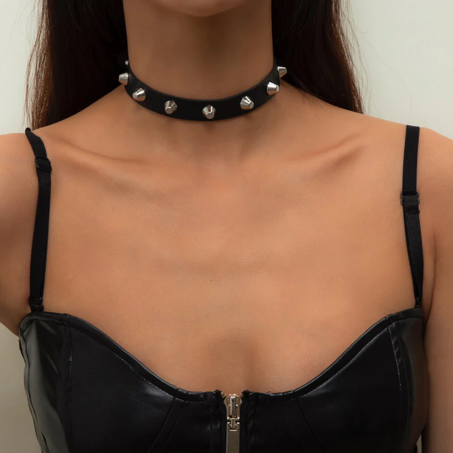 Black Faux Leather Metal Spike Choker Necklace