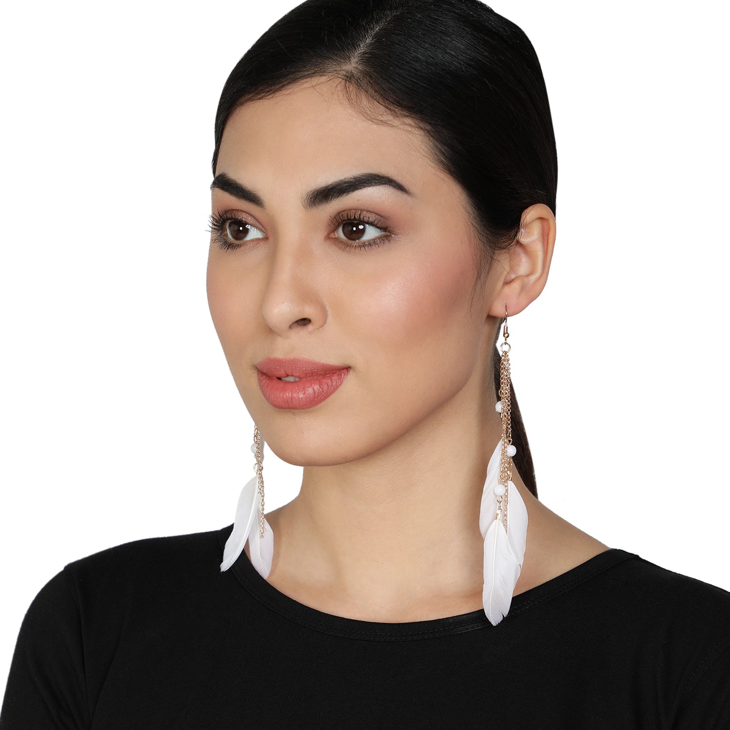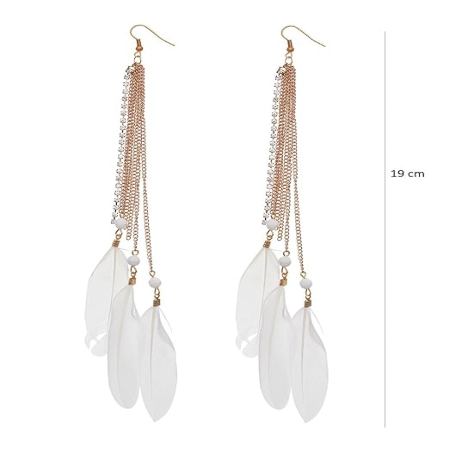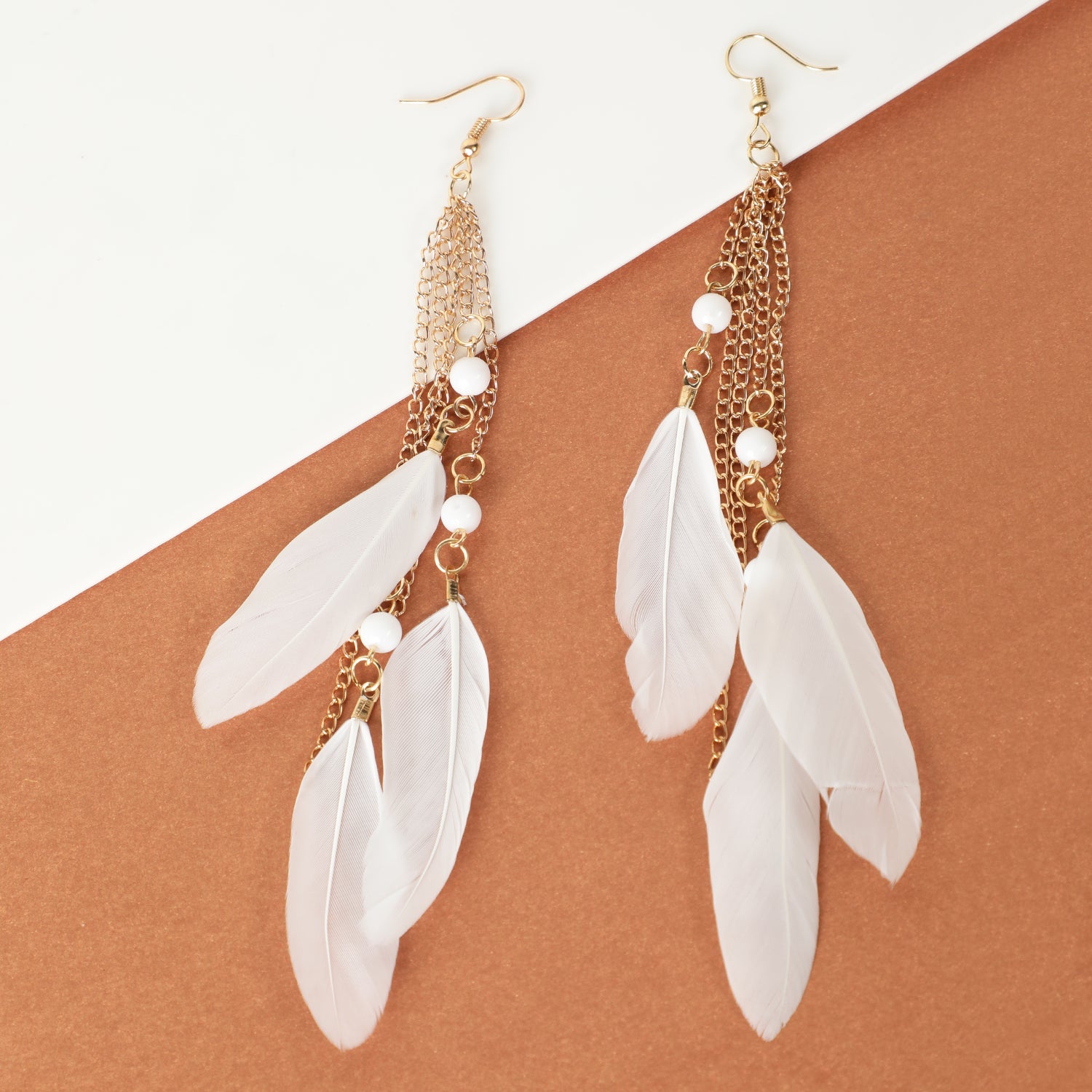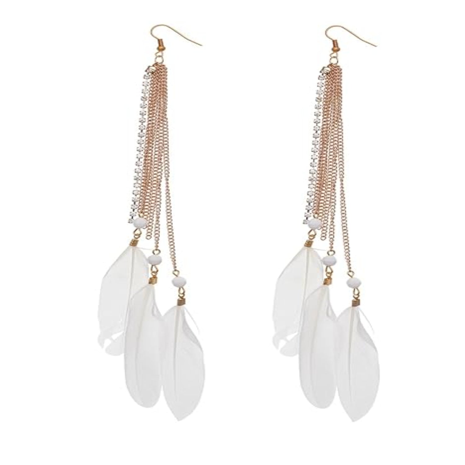 Enhance your look with gold-plated white tassel feather drop earrings. Elegant and lightweight, it adds a bohemian touch to your outfits. A perfect accessory to pair with your casual or beach outfits.