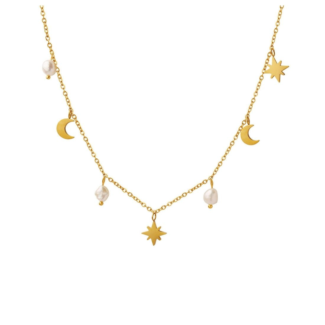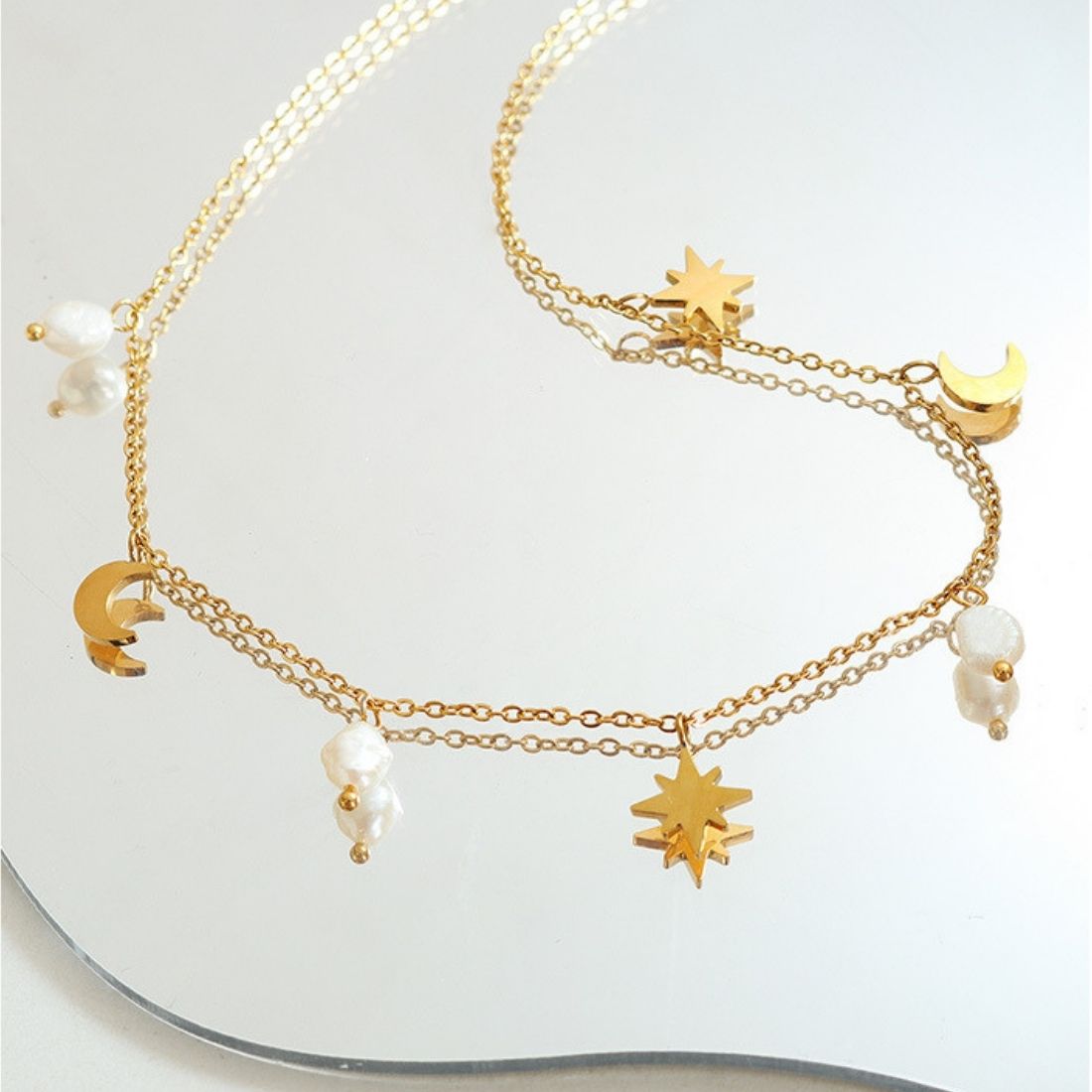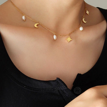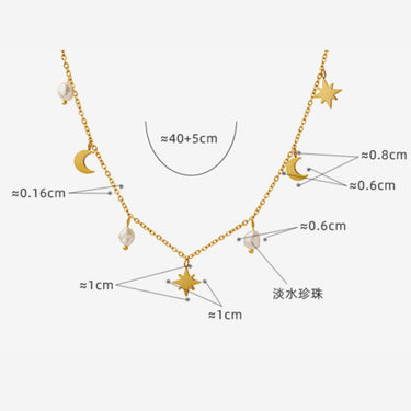 This 18K gold-plated titanium steel necklace features pearls with star and moon pendants, offering a timeless and versatile design. It’s perfect for daily wear or special occasions, adding elegance to any outfit.
