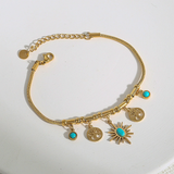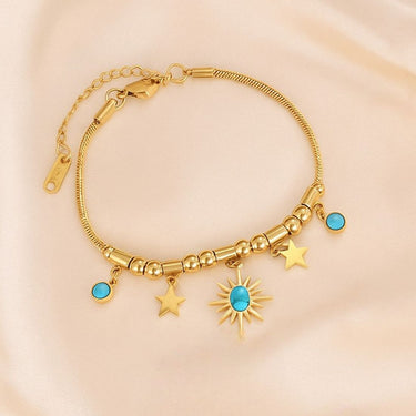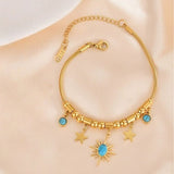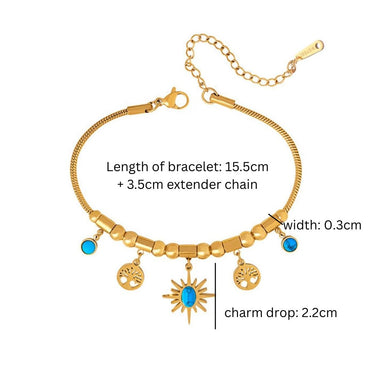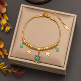 Let your wrist steal the spotlight with this dreamy charm bracelet featuring twinkling blue star and dainty tree drops—an enchanting blend of celestial glam and nature’s magic. Crafted in 18K gold-plated stainless steel, it’s anti-tarnish, and effortlessly chic. Whether you’re stacking it with your favorite chains or letting it shimmer on its own, this bracelet adds just the right touch of whimsy to brunch dates, beach days, or glam nights out. A perfect gift for your stylish bestie—or yourself!