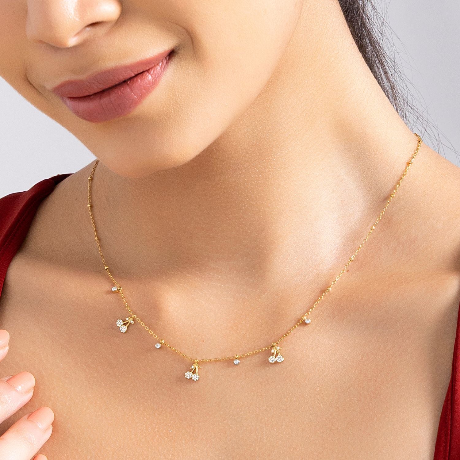 Experience the enchantment of this exquisite golden chain, adorned with a scattering of tiny, shimmering cherryies in shimmering zircon stones. Designed for versatility, its adjustable length allows for a personalized fit, making it perfect for layering or wearing as a standalone whisper of elegance. Crafted from waterproof and hypoallergenic stainless steel, this piece is a testament to delicate beauty and lasting comfort.