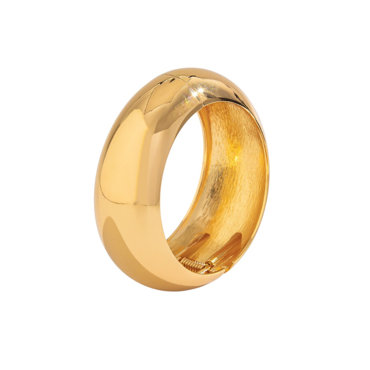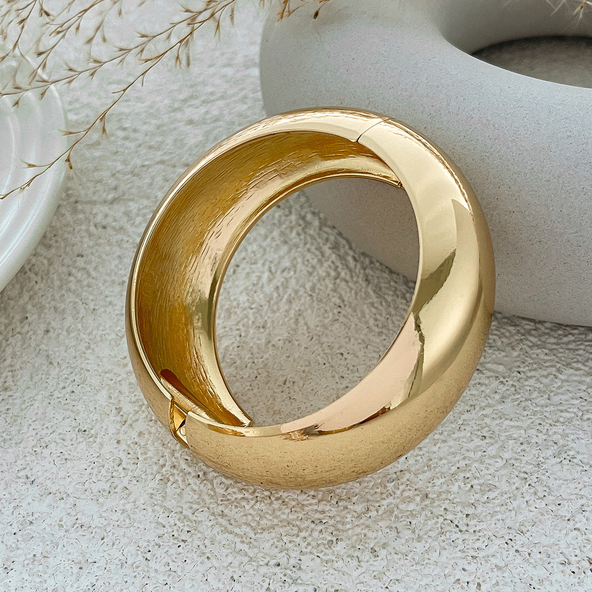 Turn heads with this glossy bold open bangle bracelet, crafted in radiant gold plating for a powerful statement look. Its chunky cuff style and smooth, polished finish bring a touch of drama to any outfit, from casual chic to evening glam. Made with anti-tarnish metal, it retains its shine and color even with frequent wear. The open design ensures a flexible fit for most wrist sizes while offering easy styling. Perfect for women and girls who love standout accessories that exude confidence and bold elegance.