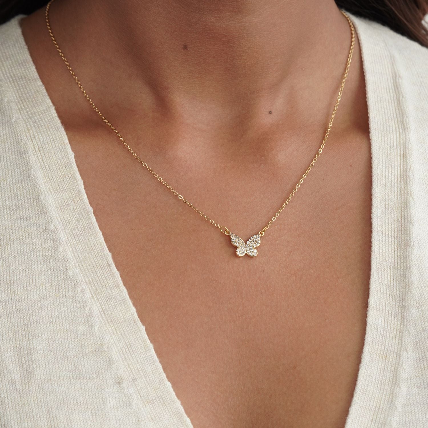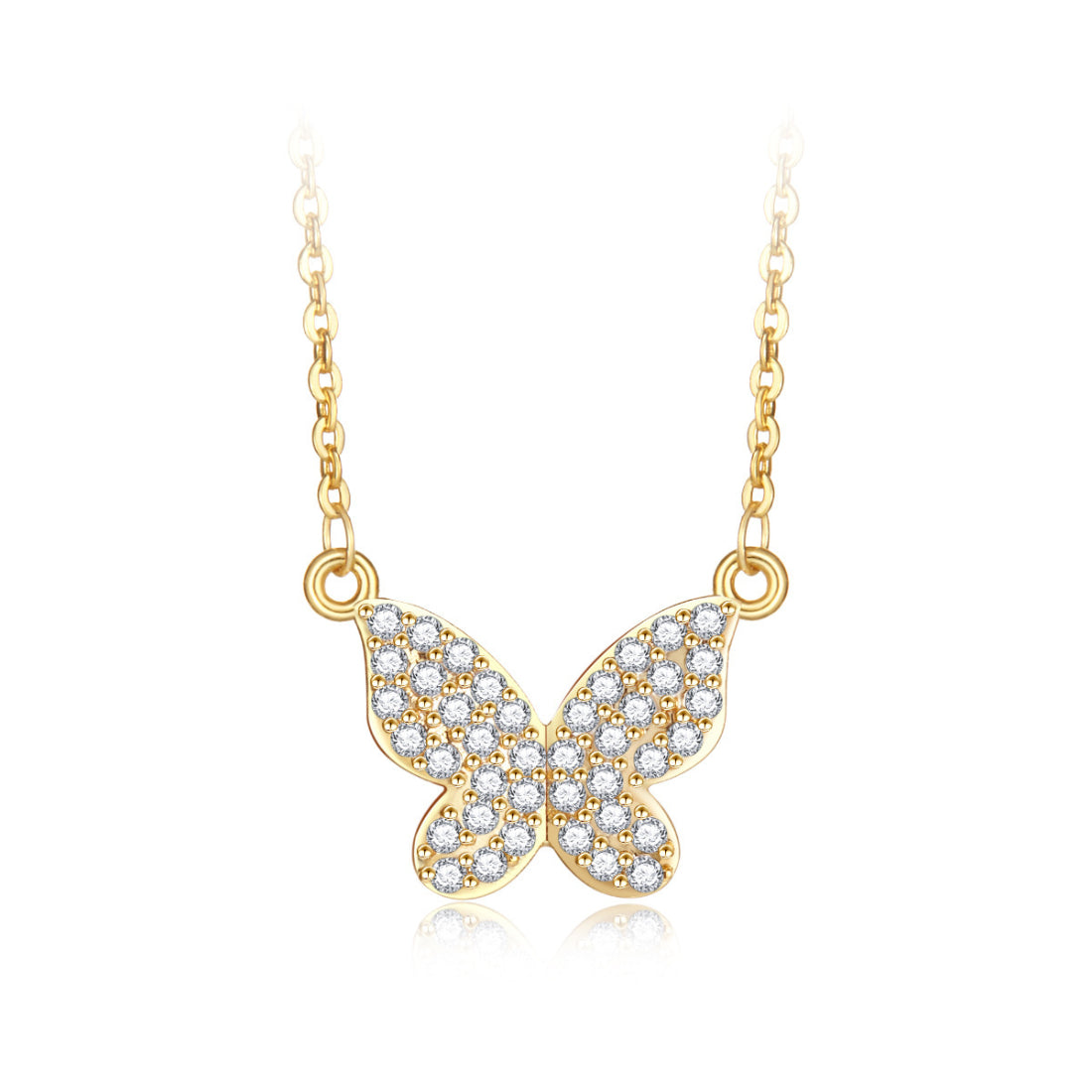 A graceful butterfly pendant adorned with sparkling zircon stones, symbolizing transformation and beauty. Whether layered or worn solo, it adds a soft sparkle and dreamy charm to any look. Perfect for the free-spirited and fashion-forward.