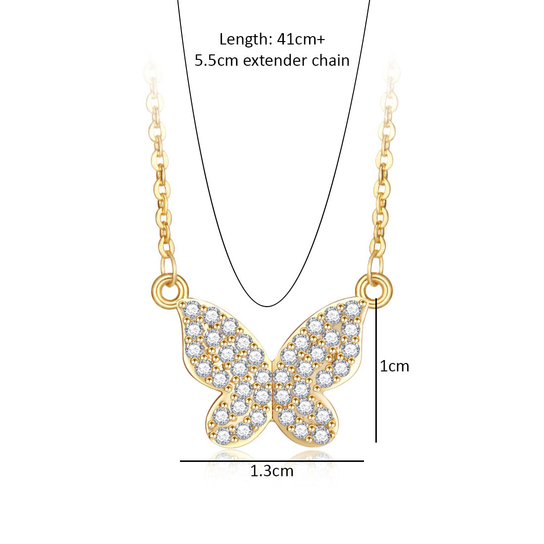 - Length: 41cm + 5cm extender chain, Butterfly: 1cm x 1.7cm