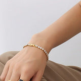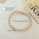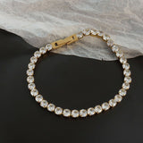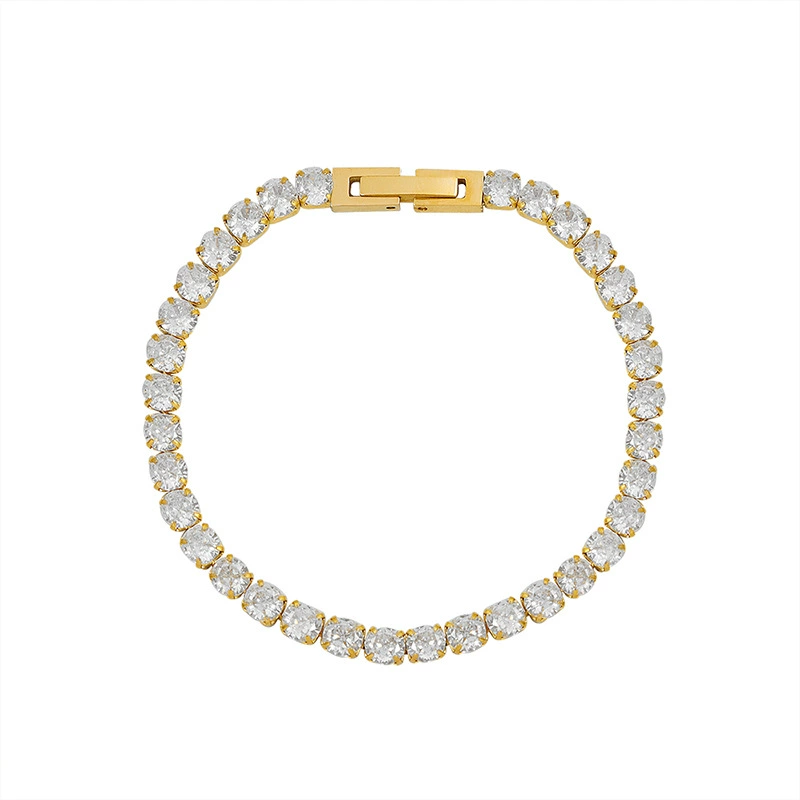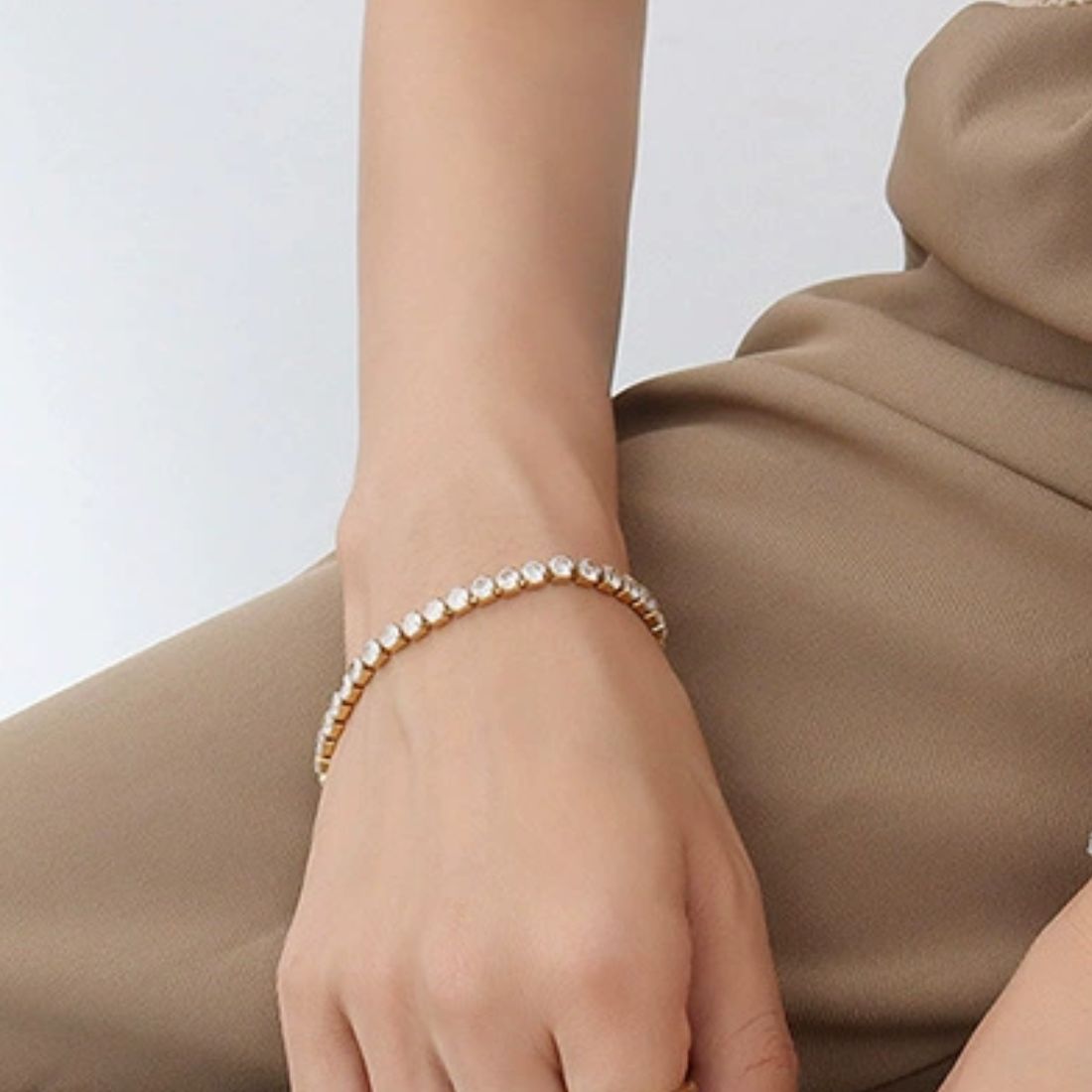 The Elowen Zircon Bracelet is a refined classic, featuring a continuous line of brilliant-cut zircon stones set in a sleek gold-toned frame. With its elegant shimmer and secure clasp, this bracelet is designed for both everyday sophistication and special occasion sparkle—perfect for stacking or wearing solo as a statement of timeless grace.