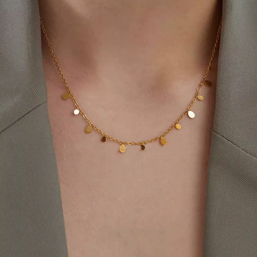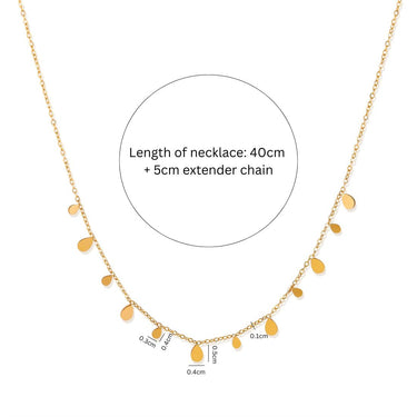 The 18K Gold Plated Tear Drops Chain Necklace features a delicate design with tiny tear drop charms gracefully hanging along a fine chain, giving it a fluid and elegant appeal. Its versatile style makes it easy to pair with casual, office, or party outfits, either as a single statement or layered with other necklaces. Crafted from titanium steel, vacuum-plated with three layers of 18K gold for lasting shine and durability. Lightweight and dainty, it adds a subtle sparkle to your neckline without being overpowering. An ideal gift choice for women and girls who love timeless, minimal jewelry.