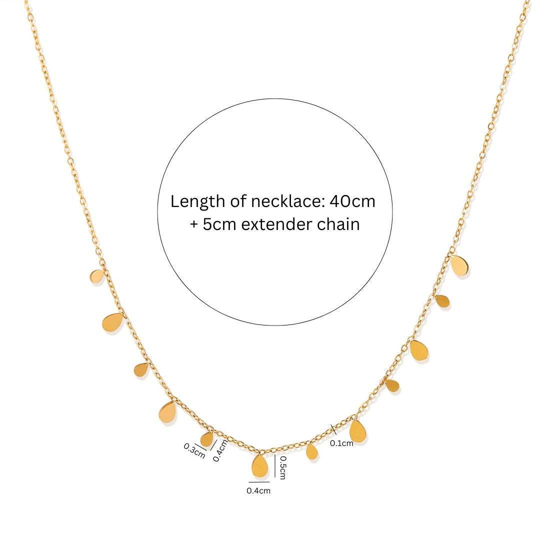 - Length of necklace: 40cm + 5cm extender chain, width: 0.1cm,tear drop: 0.5/0.4cm