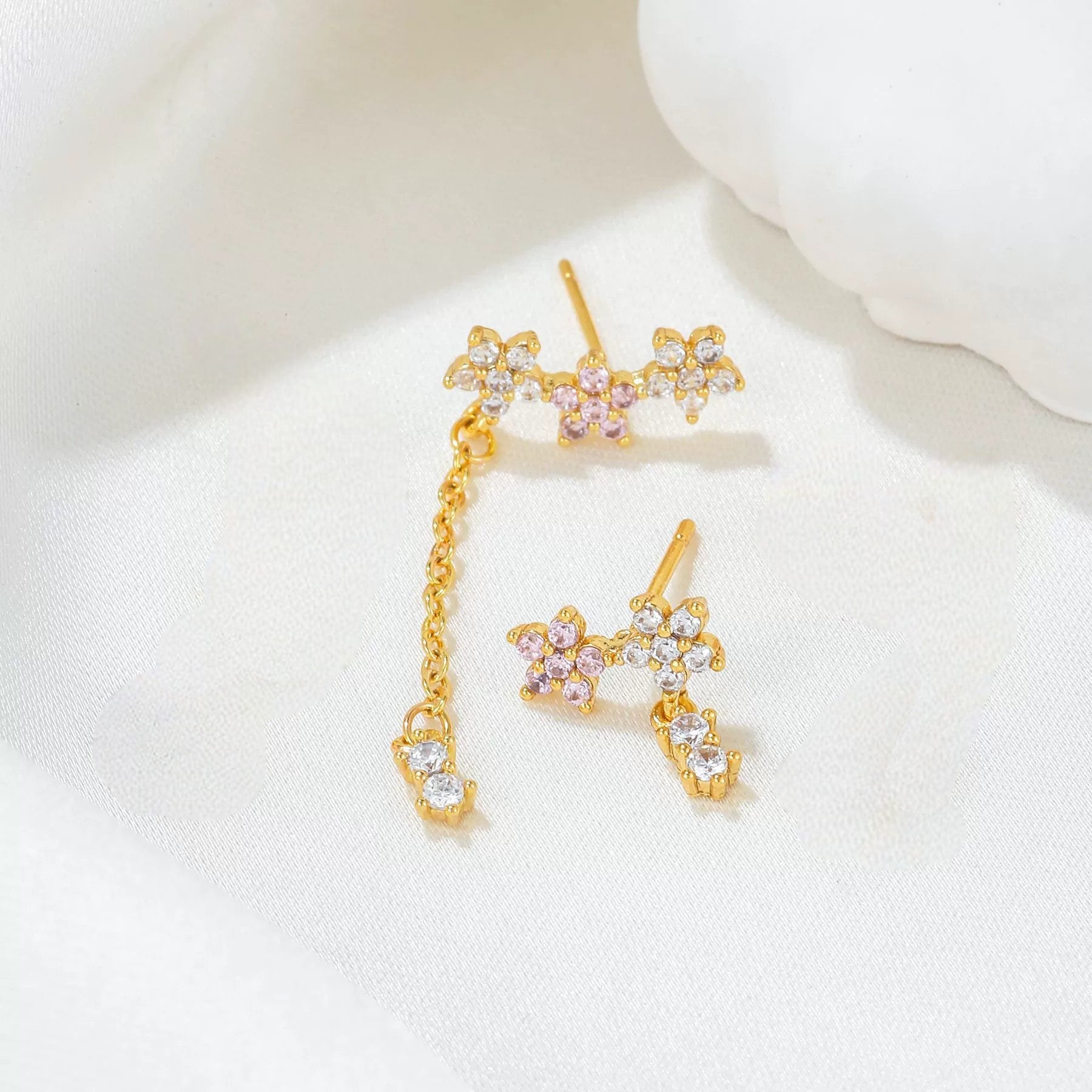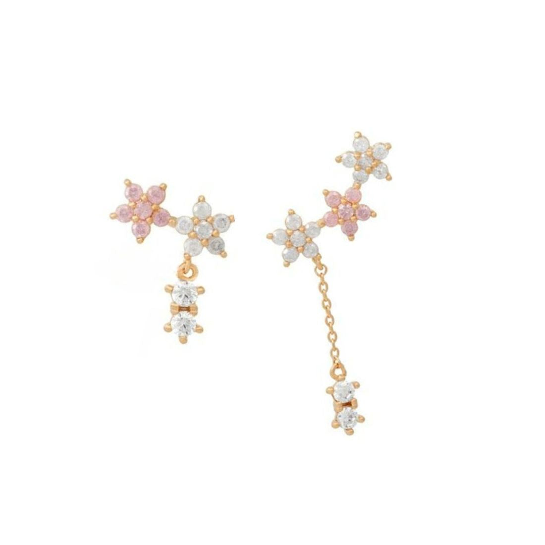 Soft petals, scattered sparkle — Fioria Floral Ear Drops (for left ear only) brings garden magic to your ears with a modern edge. This asymmetrical pair features blooming floral clusters in white and blush pink stones. One side trails into a delicate drop chain, adding graceful movement to every turn. Feminine, fresh, and beautifully unexpected.