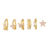 Soft, feminine and full of sparkle, this pink ear stack (for SINGLE EAR ONLY) features an enchanting mix of floral and geometric designs. Zircon stones are set into dainty flowers, shimmering hoops, and baguette-cut accents. Perfect for a playful yet elegant look, these earrings bring a subtle pop of color and shine to your everyday style.