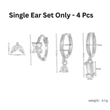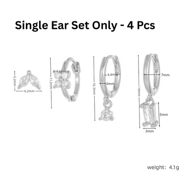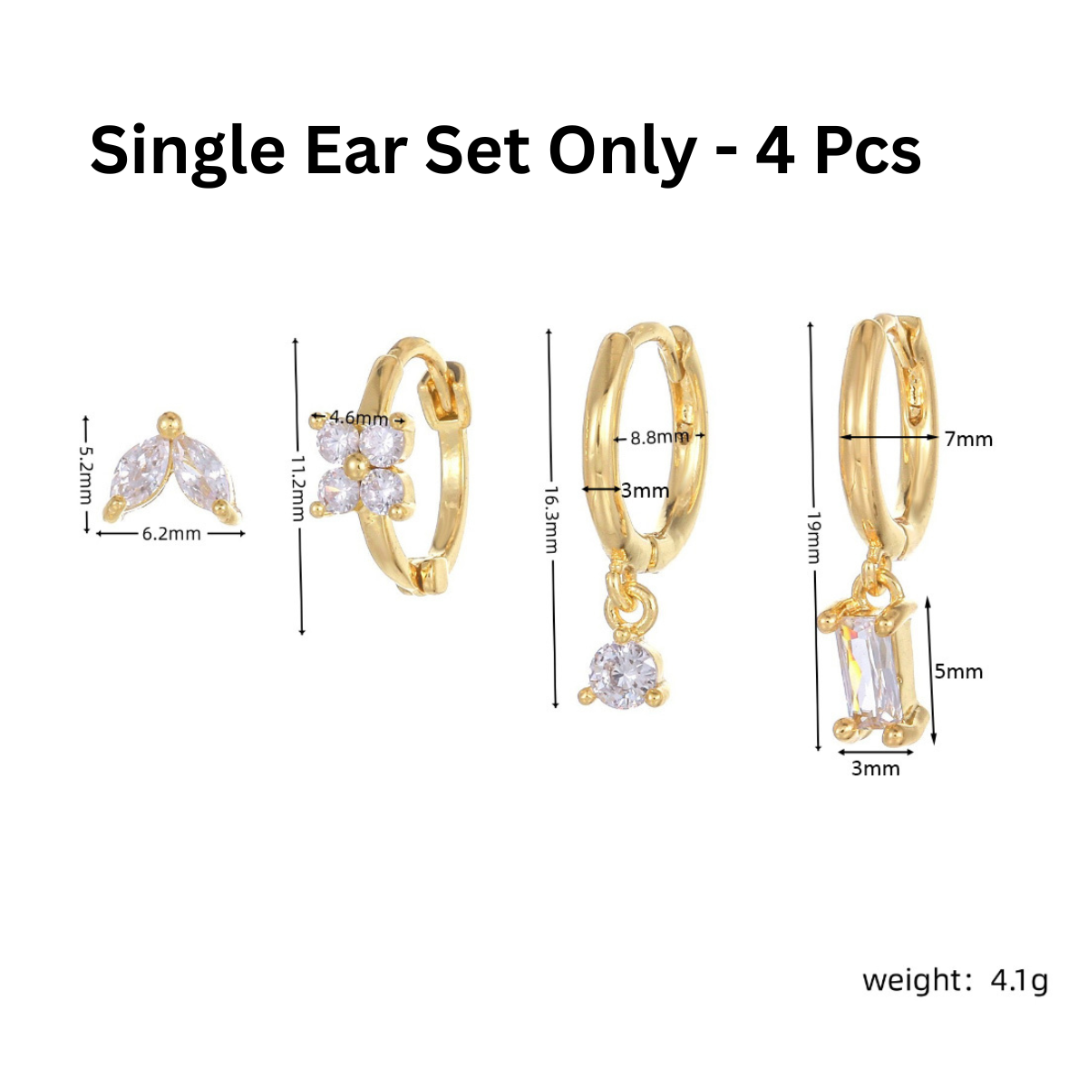 A versatile earring set (for SINGLE EAR ONLY) that features four dazzling pieces that bring a fresh pop of sparkle to your ear stack. With radiant zircon stones and chic 18k plated gold/silver accents, its perfect for a playful yet elegant look.