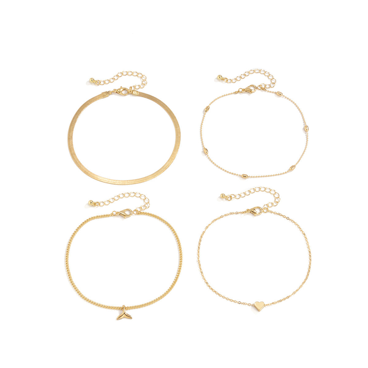 A stylish set of four gold-plated alloy anklets featuring delicate fish tail charm, heart, gold balls and a thin snake chain, perfect for an elegant and trendy casual or beach.