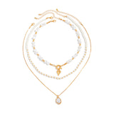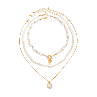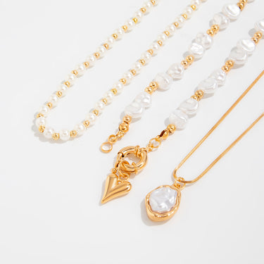 Elevate your jewelry collection with this 3-piece pearl layered necklace consisting a pearl necklace, pearl pendant and a pearl choker necklace, crafted with anti-tarnish gold plating for lasting shine. Its dainty design offers a minimal yet trendy vibe for everyday styling.