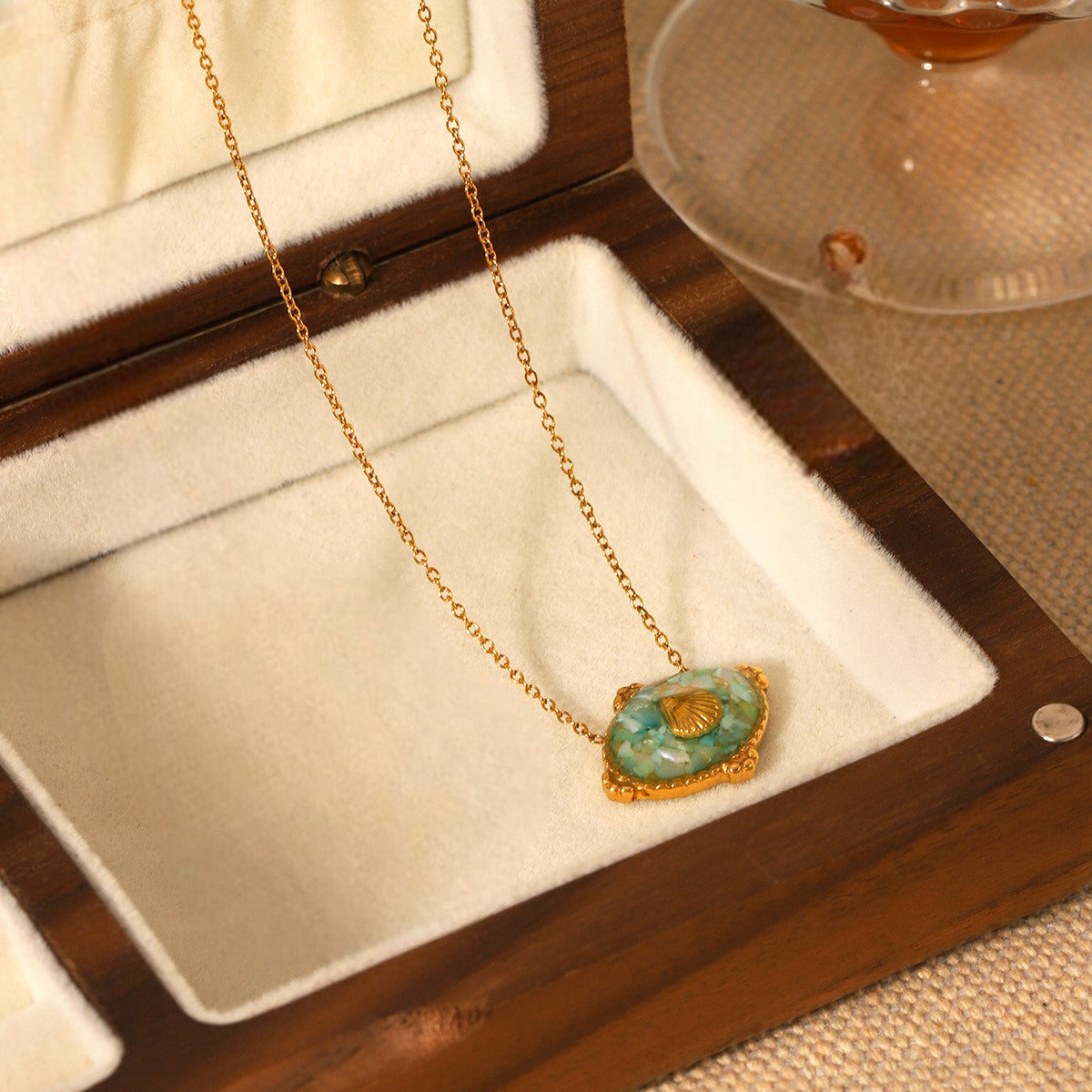 The Green Shell Pendant Necklace brings a touch of seaside magic to your style. A golden starfish rests over a luminous resin base, framed in an organic shell-like design that feels both natural and luxurious. Perfect for layering or wearing solo, this pendant adds an effortless holiday vibe to any look.