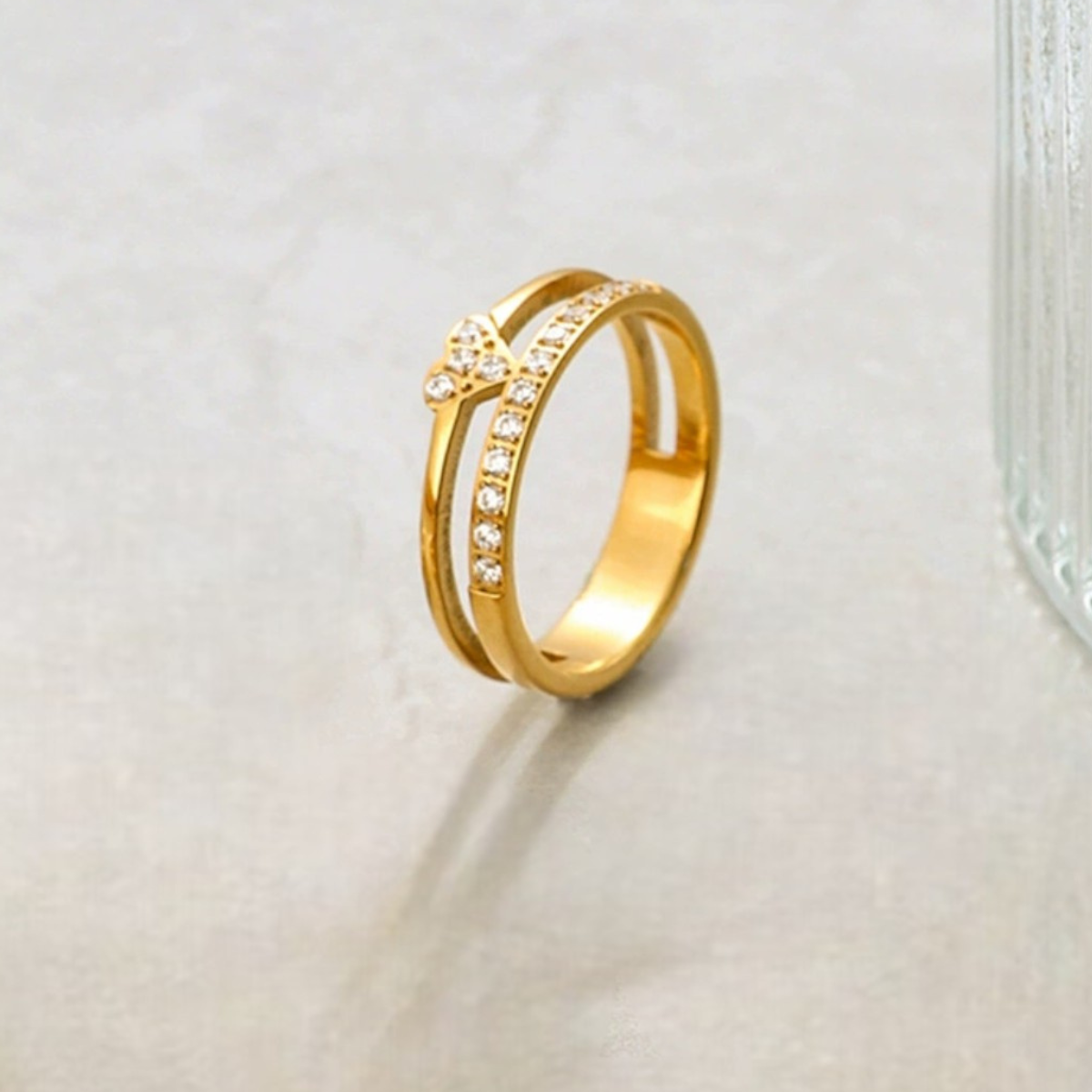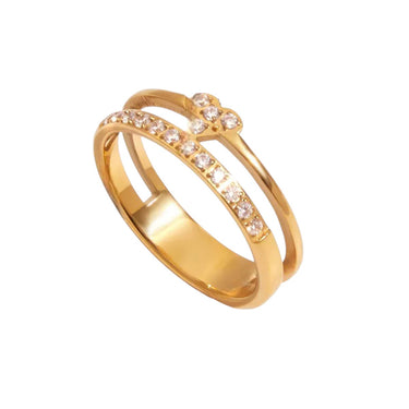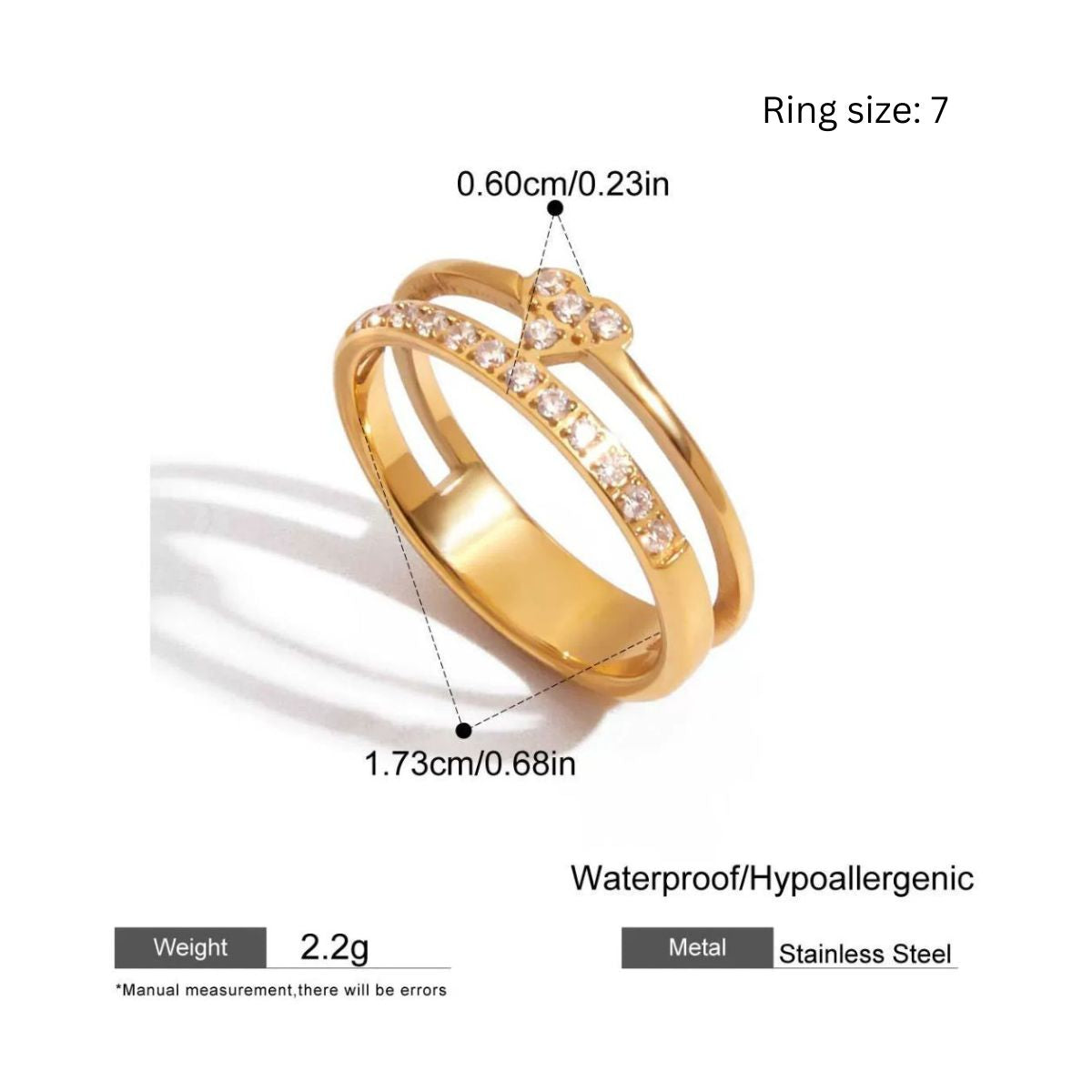 This enchanting golden ring presents a captivating duality with its elegant double-band design. One band shines with a pristine polish, while the other is adorned with a delicate line of dazzling clear zircons, culminating in a charming heart-shaped centerpiece. Crafted from waterproof and hypoallergenic stainless steel, this ring is a beautiful symbol of affection and enduring sparkle, perfect for adding a touch of romance to your hand.