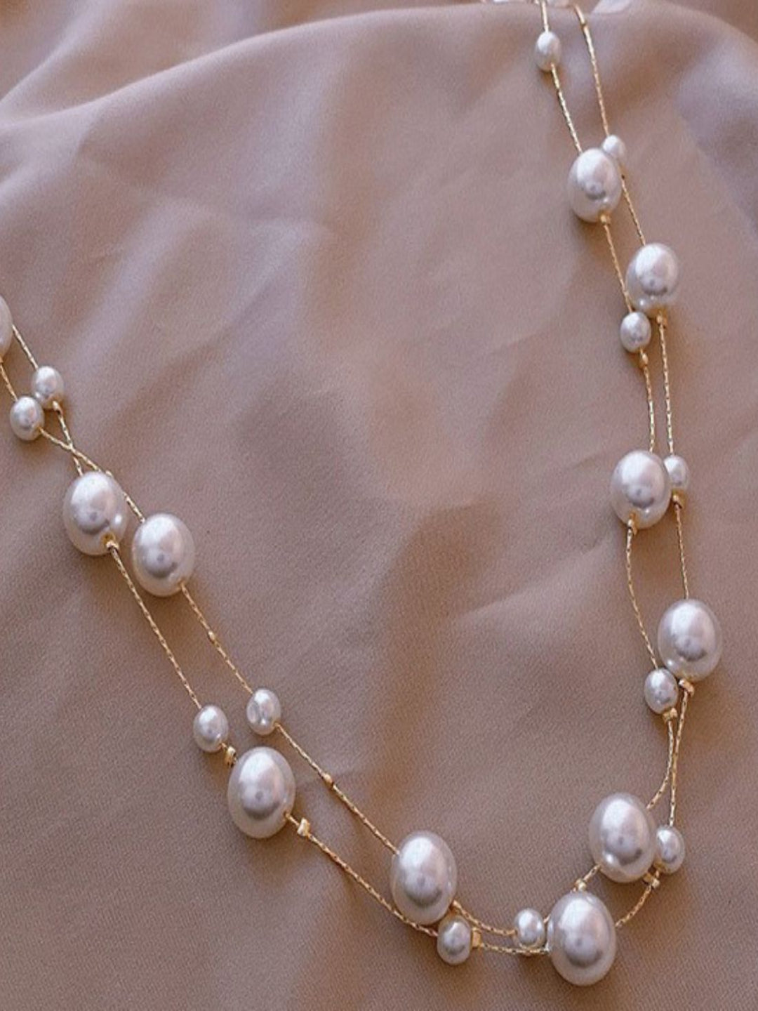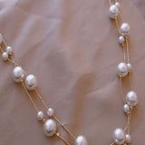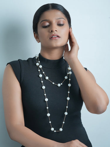 This Gold Plated White Pearl Layered Necklace is crafted from stainless steel, features chains with scattered white pearls, offering timeless elegance perfect for party wear.