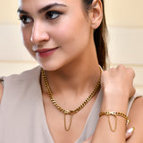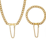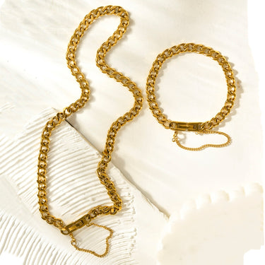 Crafted from 18K gold-plated titanium steel, this necklace and bracelet set features a central bar accent with a chain loop drop. Adjustable and versatile, it’s perfect for casual outings or formal events.