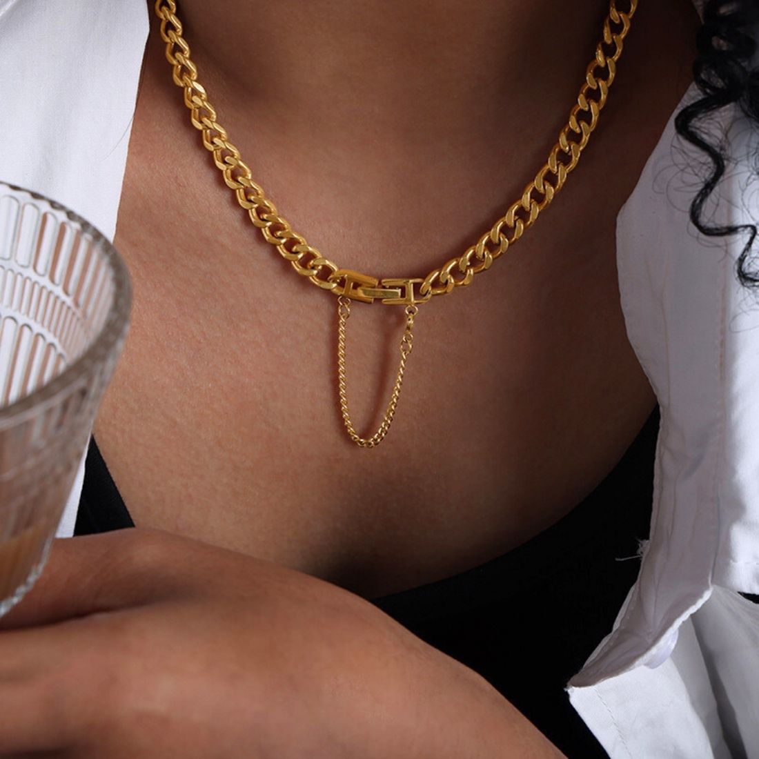 Crafted from 18K gold-plated titanium steel, this modern necklace features a central bar accent with a chain loop drop. Adjustable and versatile, it’s perfect for casual outings or formal events.