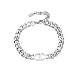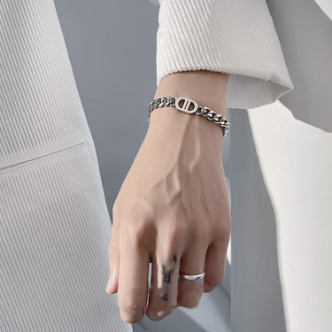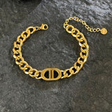 This 18k plated bracelet features a bold chain-link design with a striking "Double D" monogram centerpiece, offering a stylish, adjustable fit for any occasion.