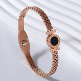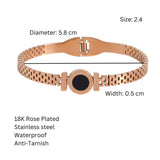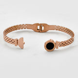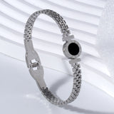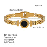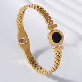 This 18k plated bracelet features a bold link design, and a black enamel centerpiece with Roman numerals and a "LOVE" engraved, offering a blend of elegance and contemporary style for any occasion.