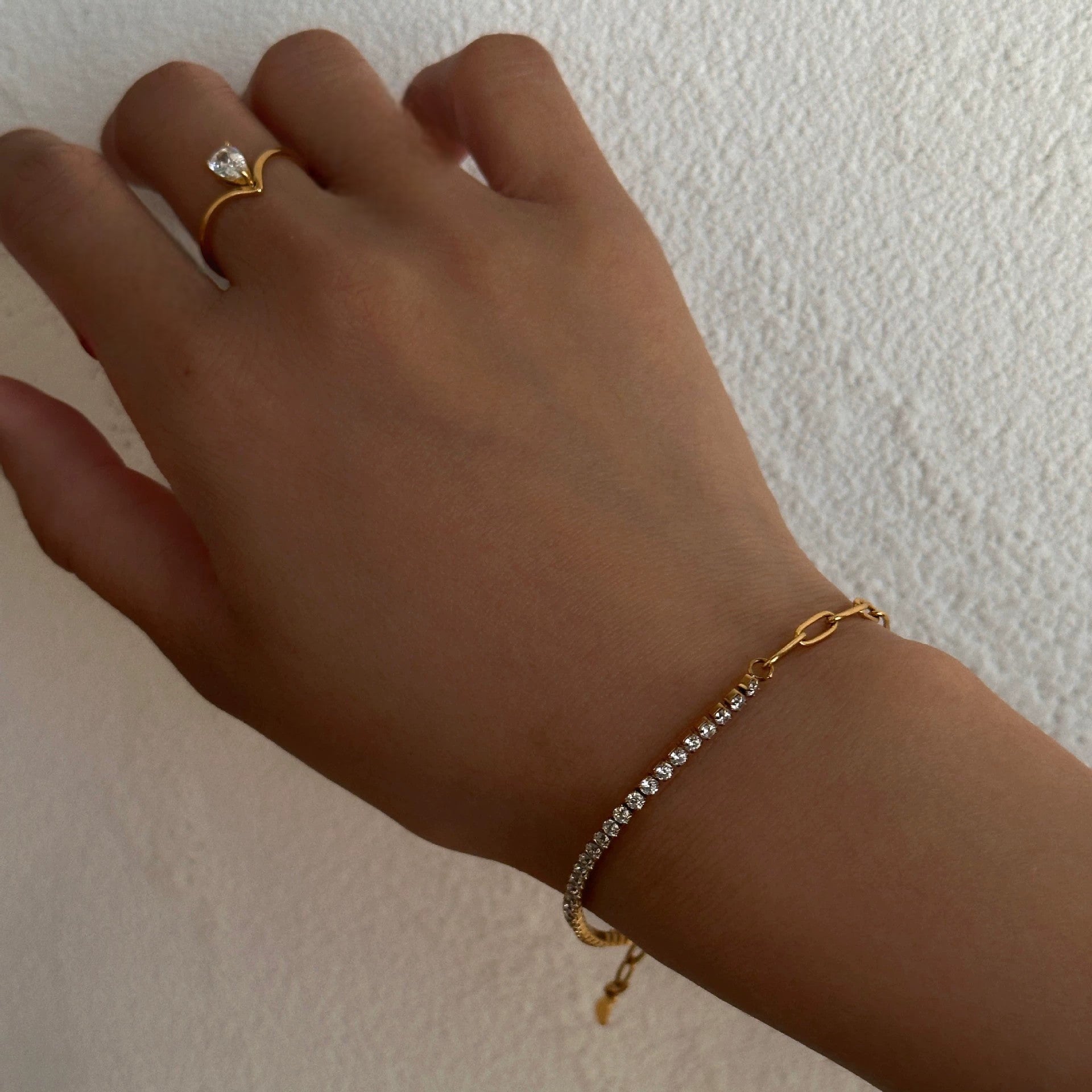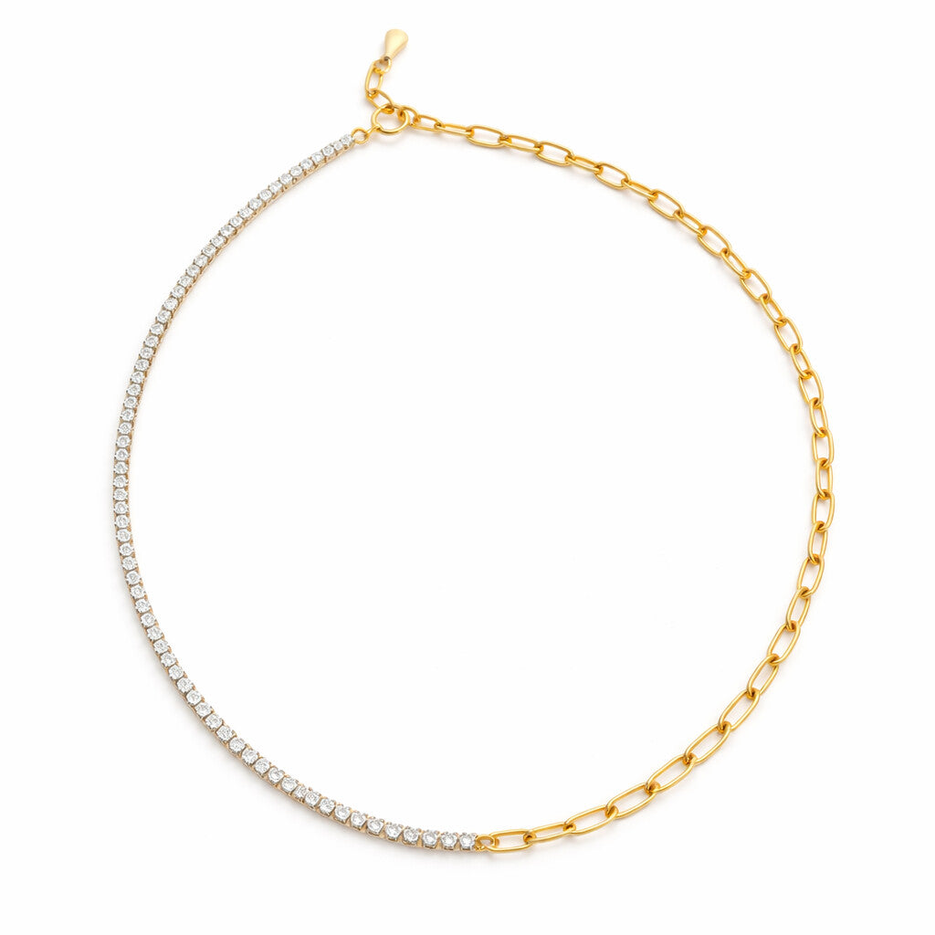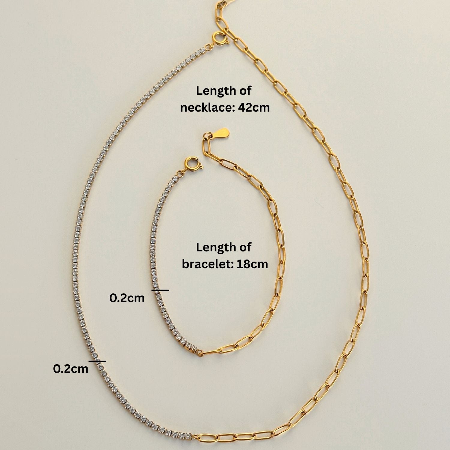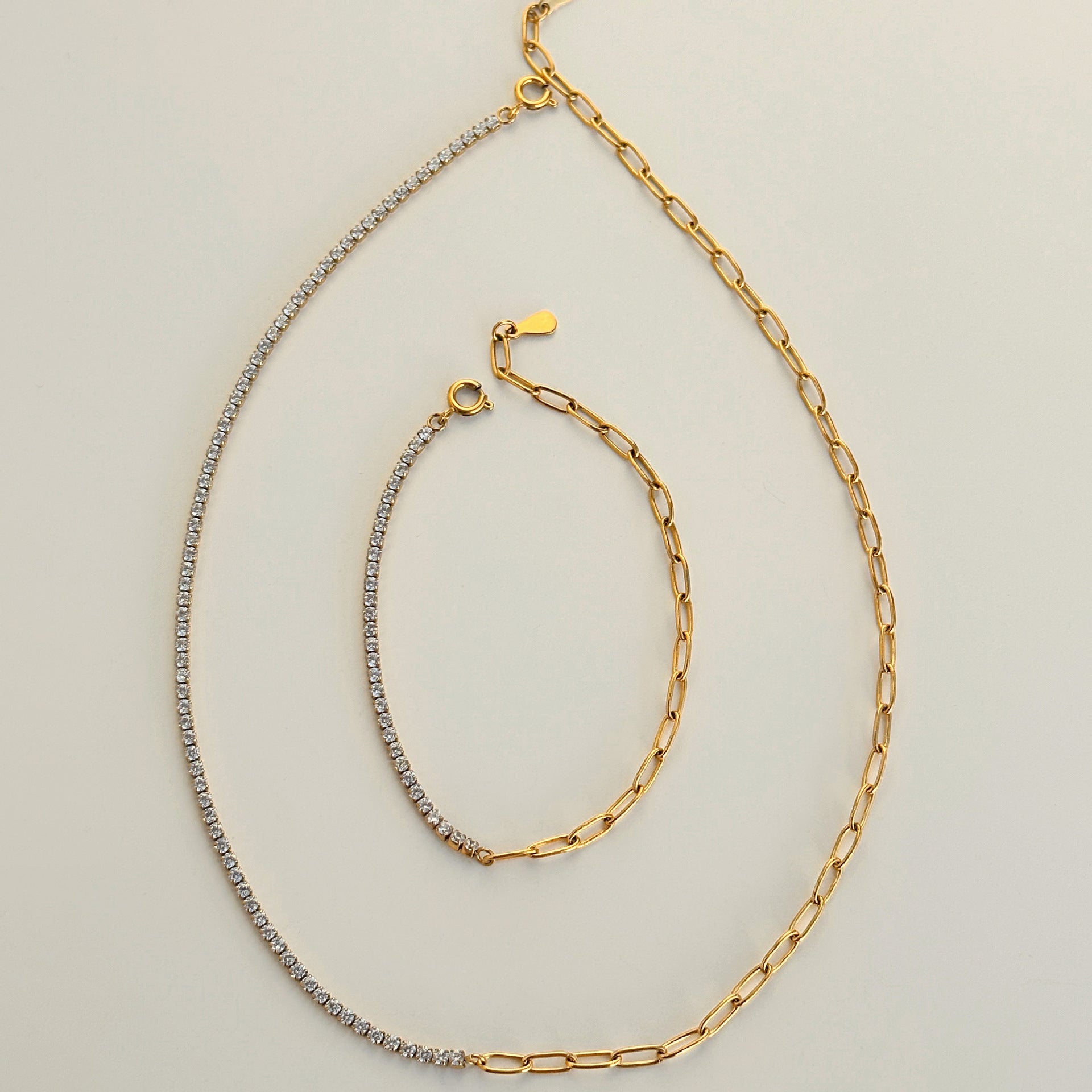 The Lumi Necklace & Bracelet Set is a delicate and captivating piece that drapes the wrist with a stunning contrast. One half features a continuous line of brilliant, bezel-set stones that shimmer with every movement, while the other half is a sleek, paperclip-style chain. This striking combination makes the Lumina Bracelet a modern and unique accessory for any occasion.