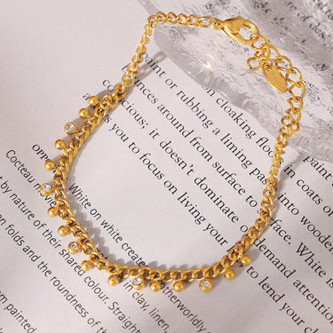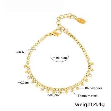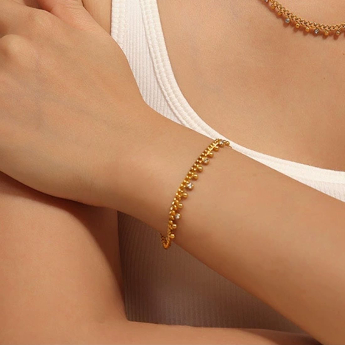 A delicate fusion of sparkle and edge, the Lunelle Zircon Bracelet features a titanium steel chain adorned with mini golden drops and dainty zircons. Designed for effortless layering or solo shine, its adjustable clasp ensures a perfect fit from day to night. Lightweight, playful, and subtly luxe—your new everyday favourite.