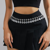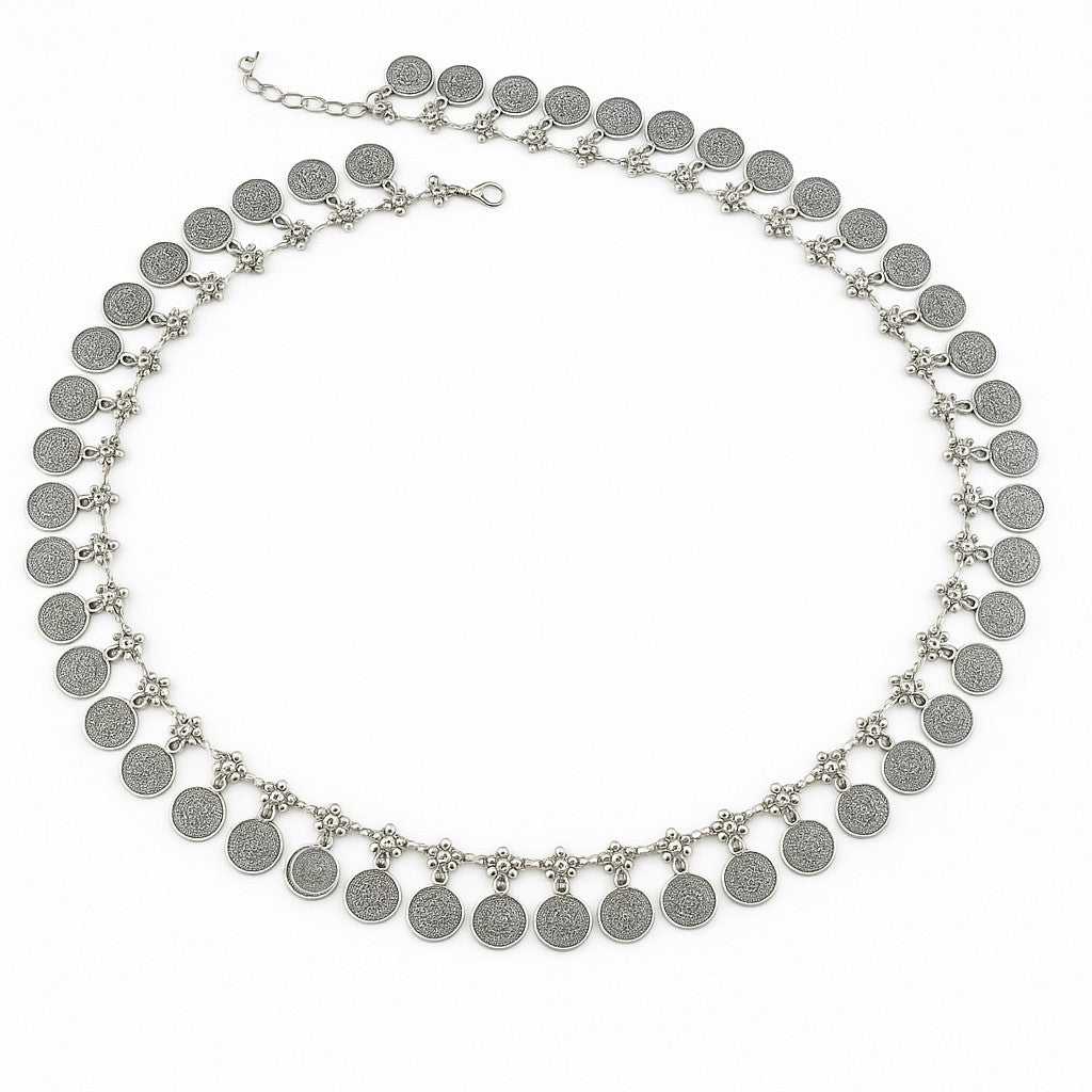 Step into your boho spirit with this silver-plated round coin waist chain that captures ethnic charm and modern beach aesthetics. Designed with oxidised detailing, it drapes beautifully around the waist, perfect for pairing with skirts, sarees, or crop tops. A versatile piece that enhances your beachwear, vacation looks, and festive outfits with effortless grace.