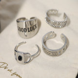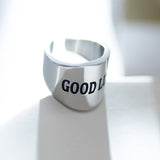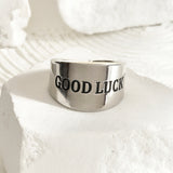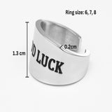 Stylish 18K Silverplated ring with a "GOOD LUCK" engraving, crafted from titanium steel for lasting wear.
