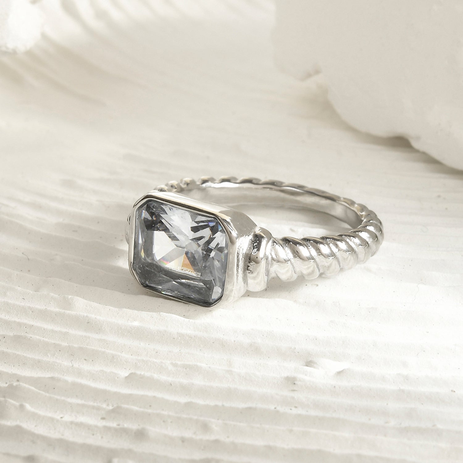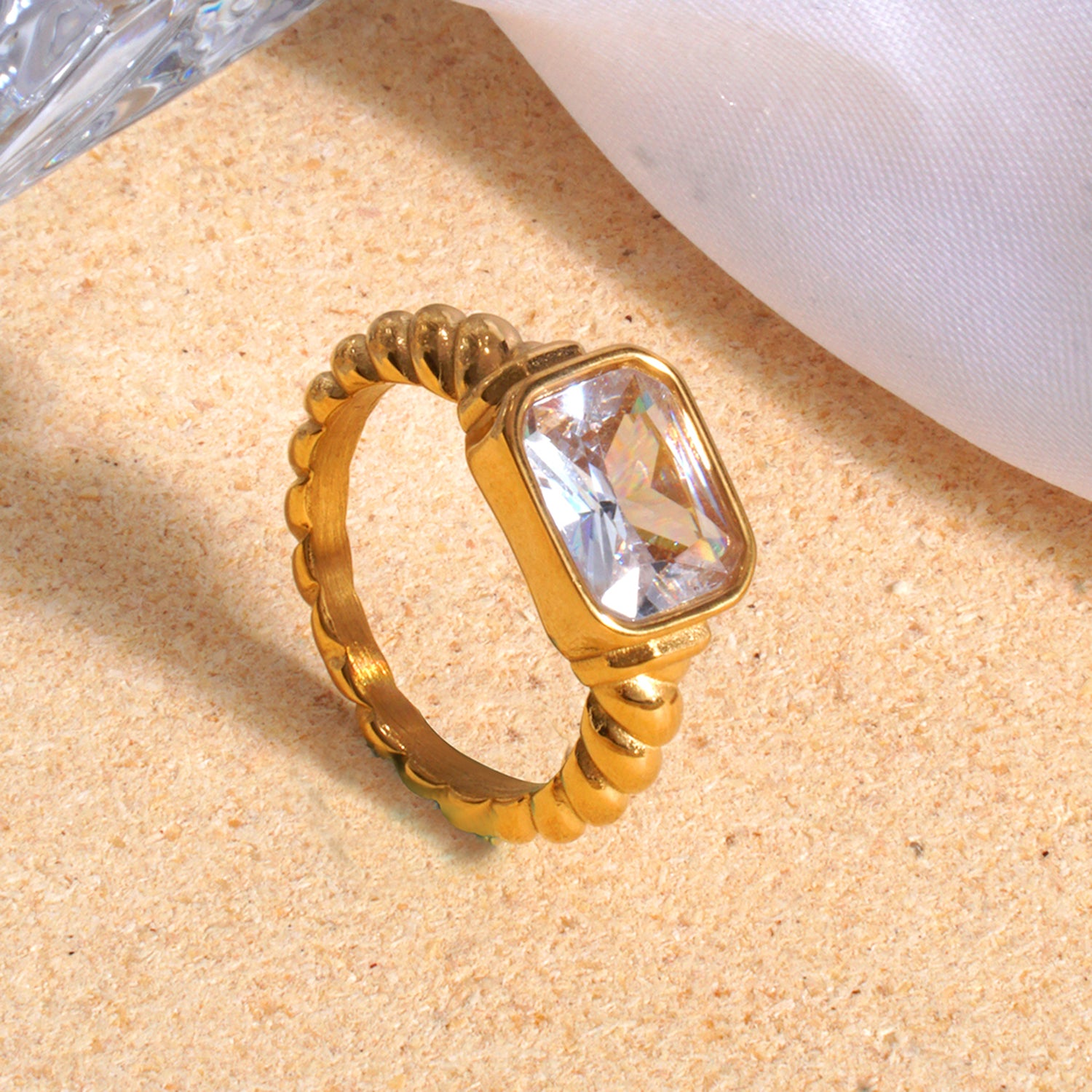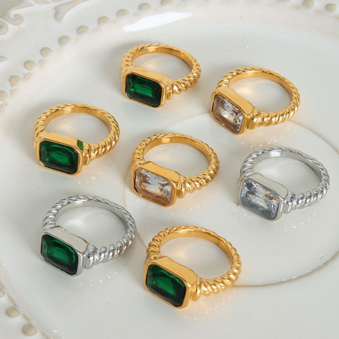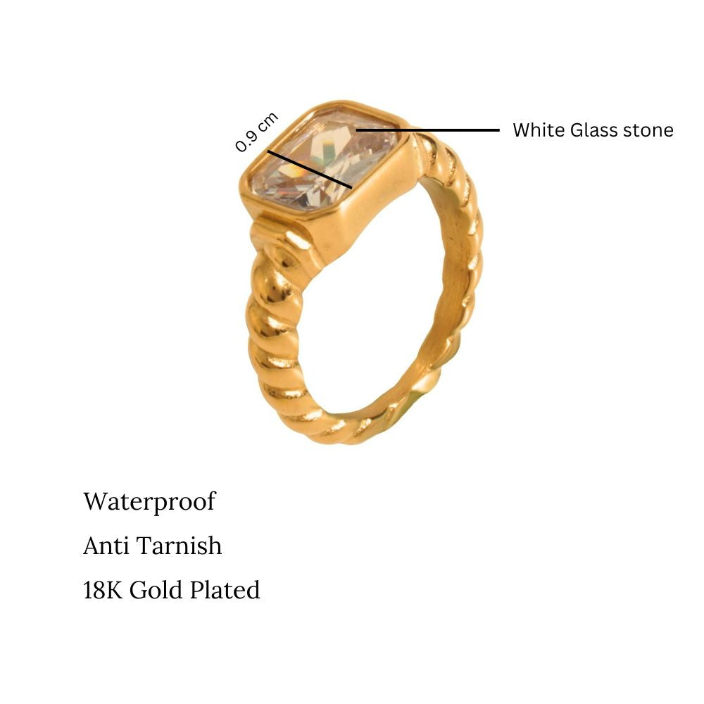 Crafted from titanium steel with 18K plating, this ring showcases a striking rectangular glass stone and twisted rope detailing, combining contemporary elegance with timeless style for any occasion.