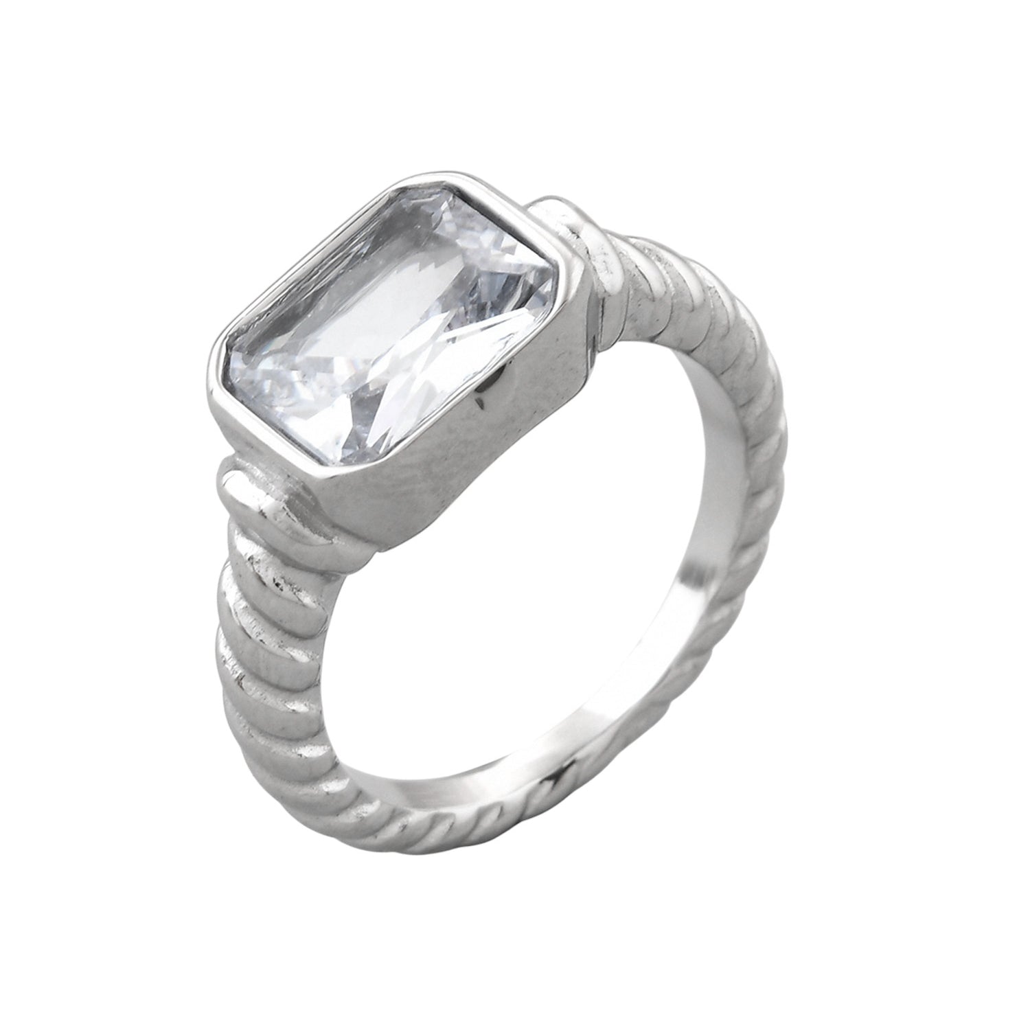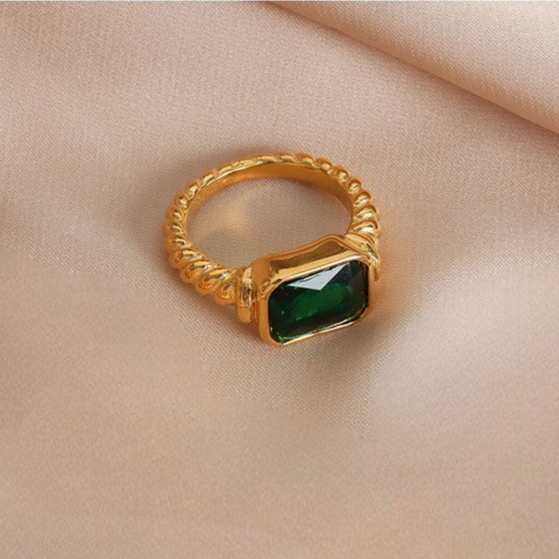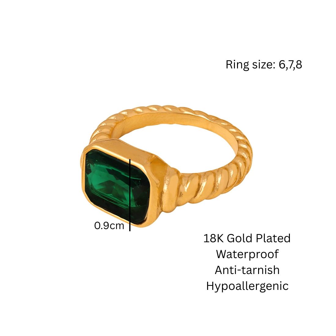 Crafted from titanium steel with 18K plating, this ring showcases a striking rectangular glass stone and twisted rope detailing, combining contemporary elegance with timeless style for any occasion.