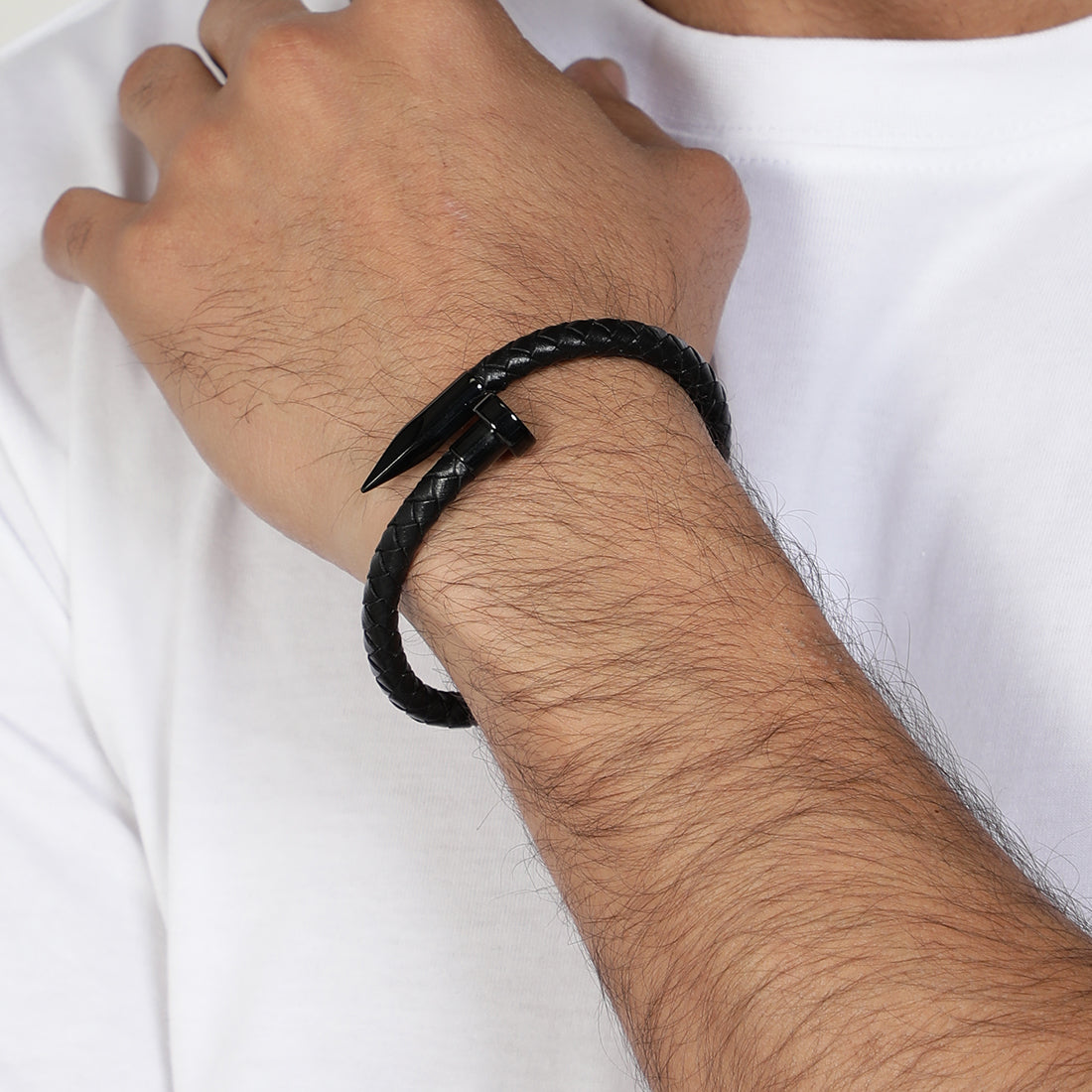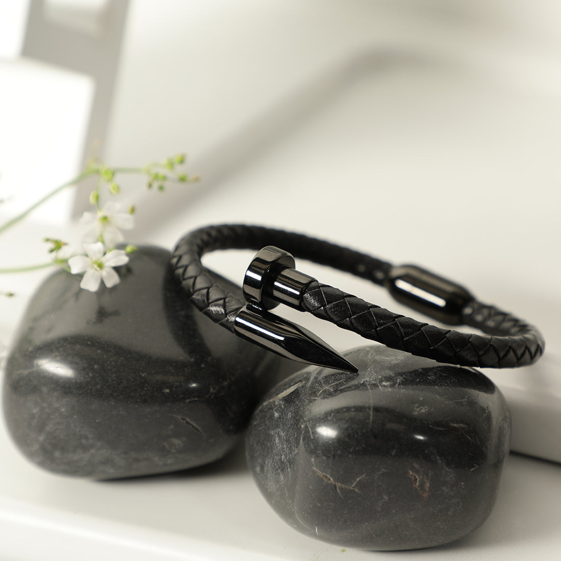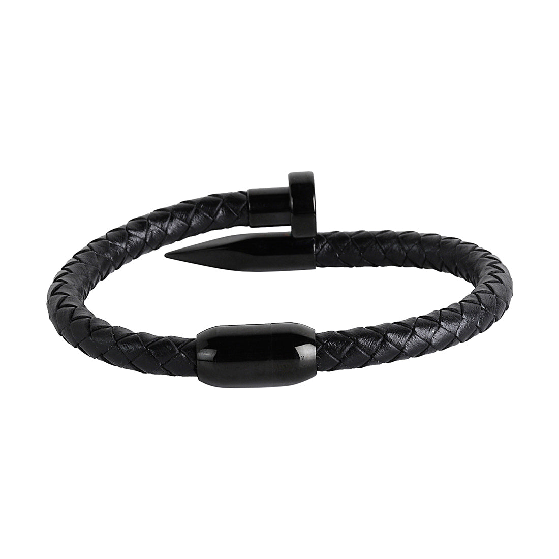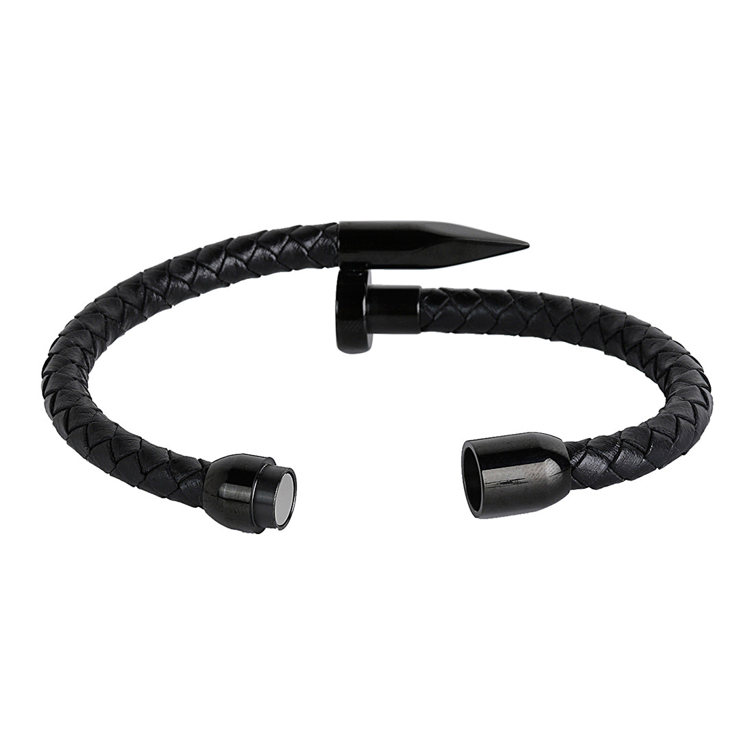 A rugged black braided leather bracelet featuring a sleek nail design and a secure magnetic clasp. A perfect blend of style and durability for men and boys.