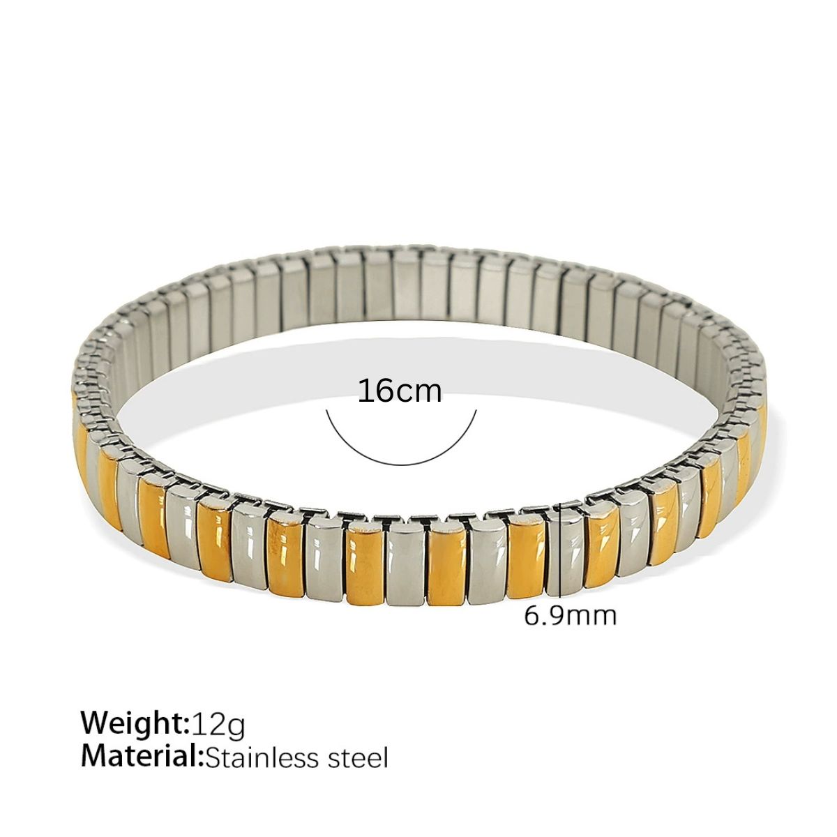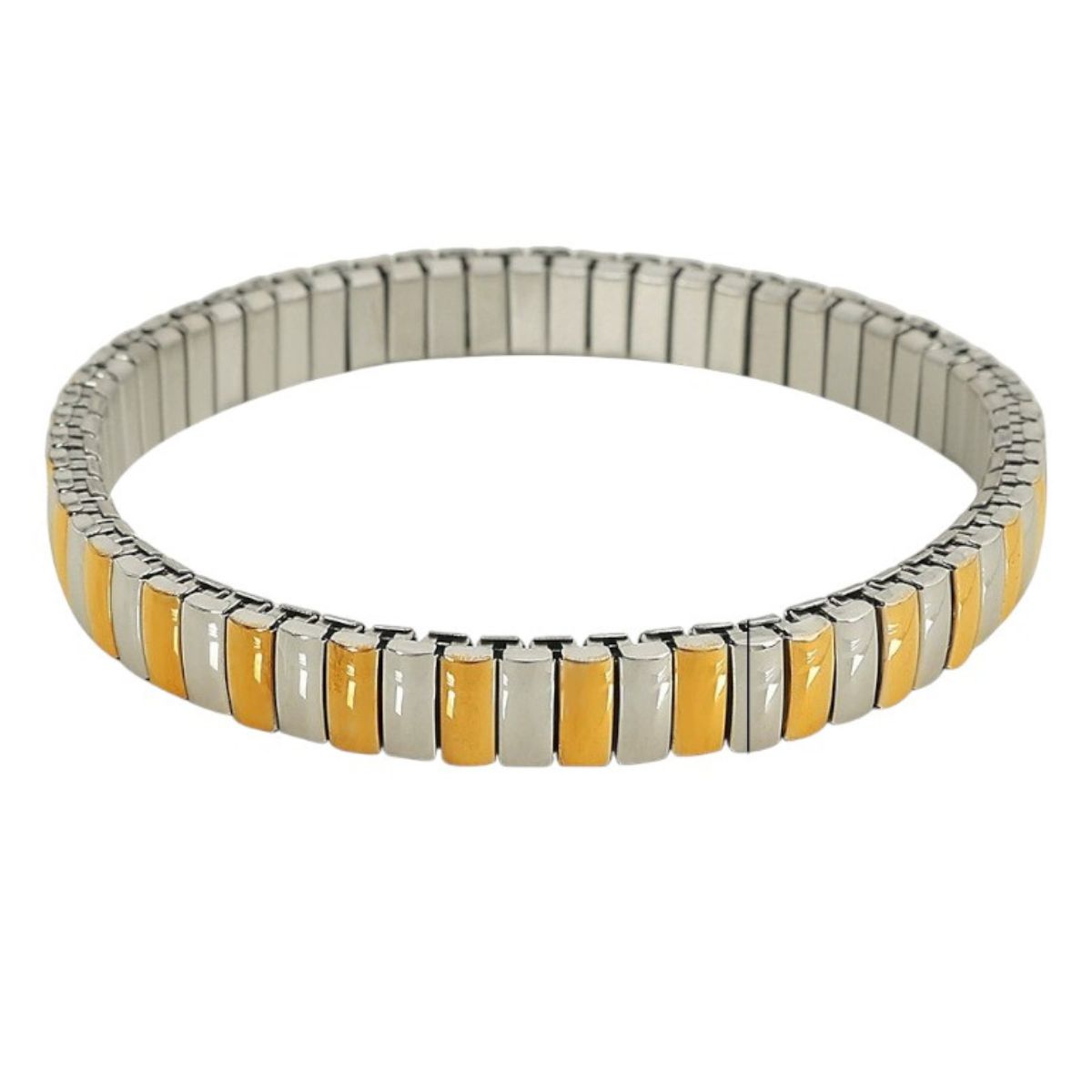 Add a contemporary edge to your wrist game with this 18K plated two-tone elastic bangle bracelet for men. The flexible fit and dual-tone finish make it a versatile piece that moves effortlessly from workwear to casual looks.