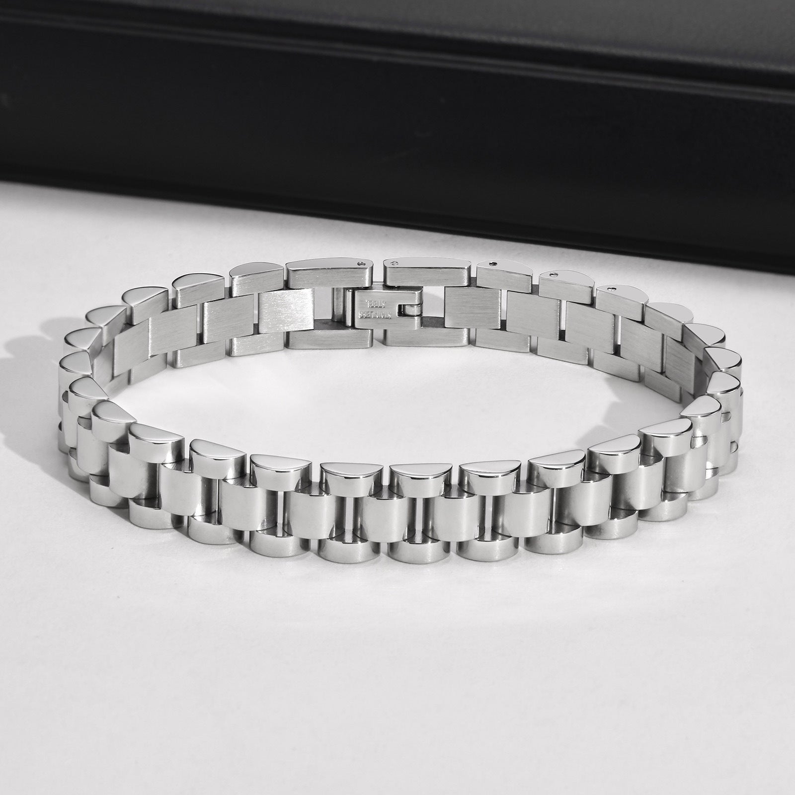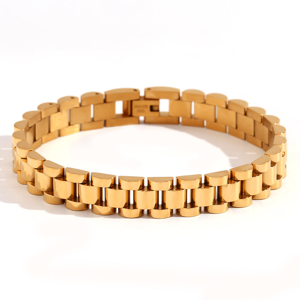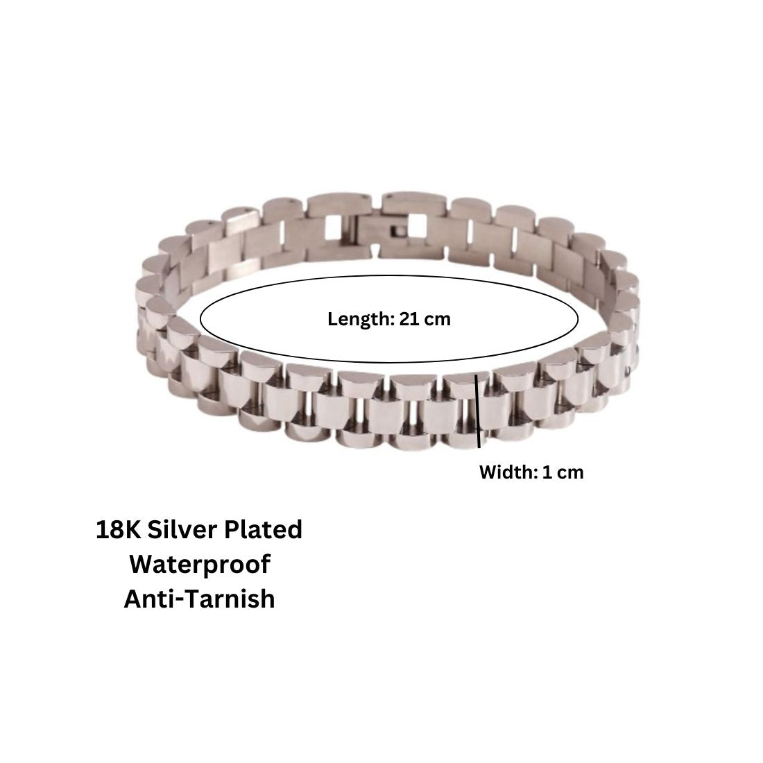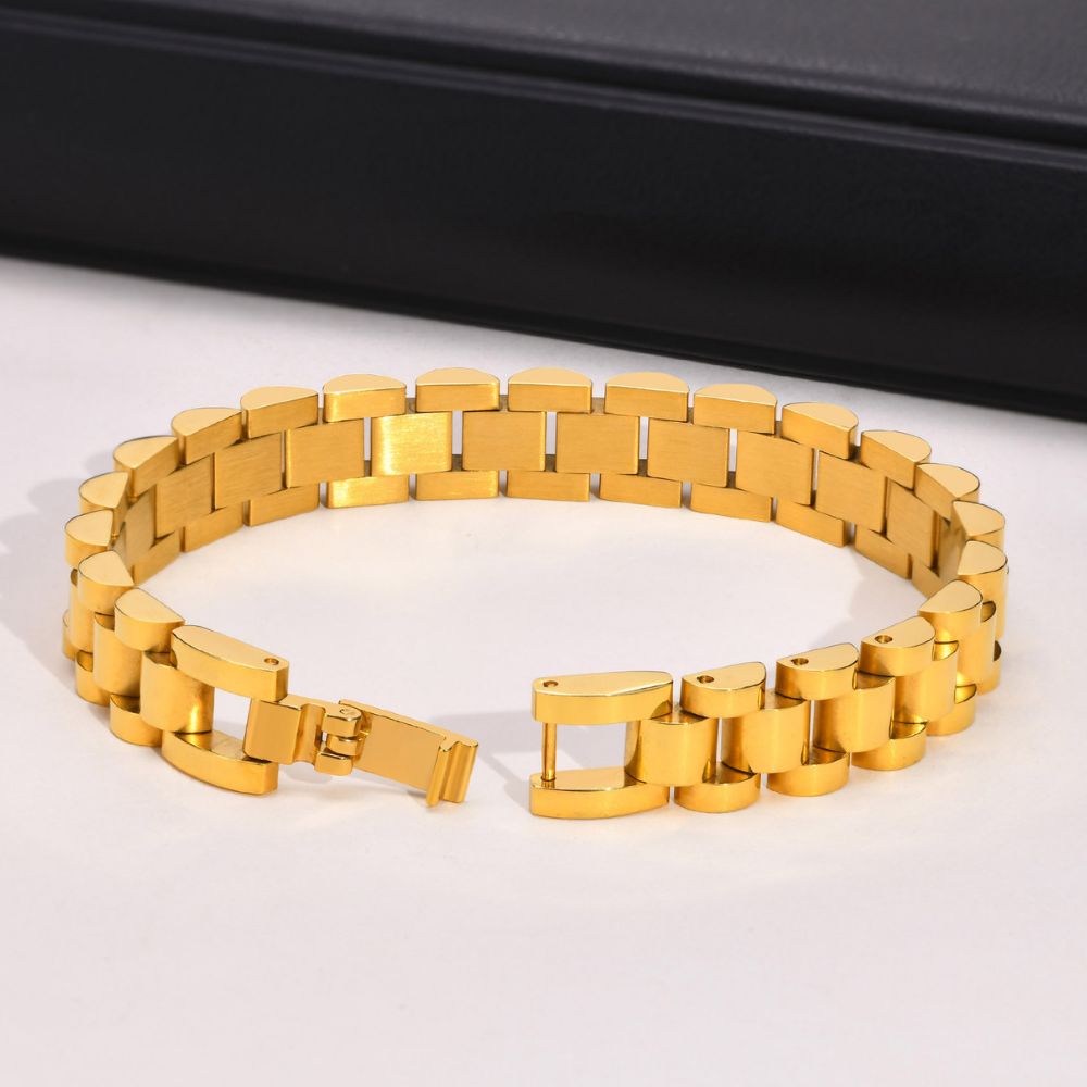 This bold gold/silver-plated wide-link bracelet combines classic style with a secure clasp for everyday comfort. Durable and versatile, it’s perfect for any outfit or a thoughtful gift for special occasions.