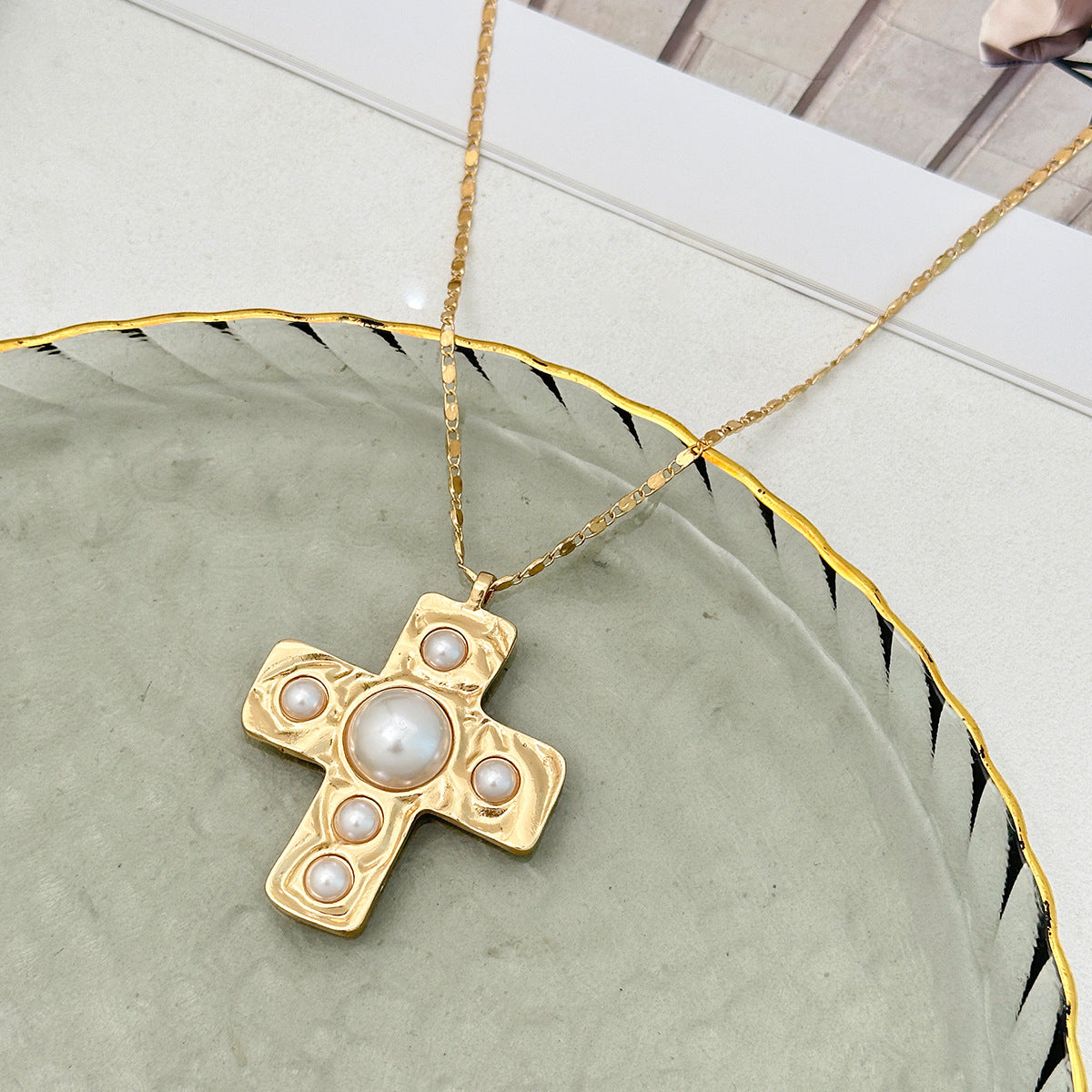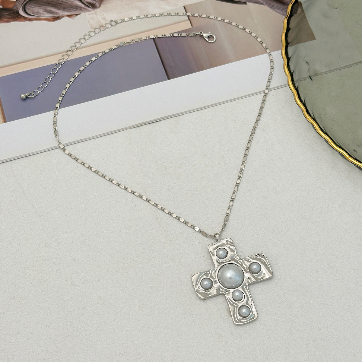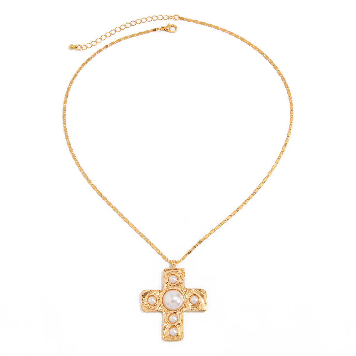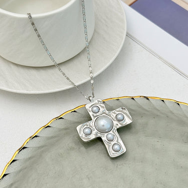 The Meya Cross Necklace is a statement of timeless power and grace. Featuring a bold hammered cross pendant adorned with luminous pearls, it hangs from a textured beaded chain that radiates strength and elegance. Available in both gold and silver finishes, this necklace is the perfect blend of vintage opulence and contemporary edge—made to command attention.