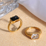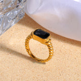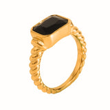 This titanium steel 18K gold-plated ring features a bold rectangular black glass stone and a twisted rope detail, blending modern elegance with classic style for any occasion.