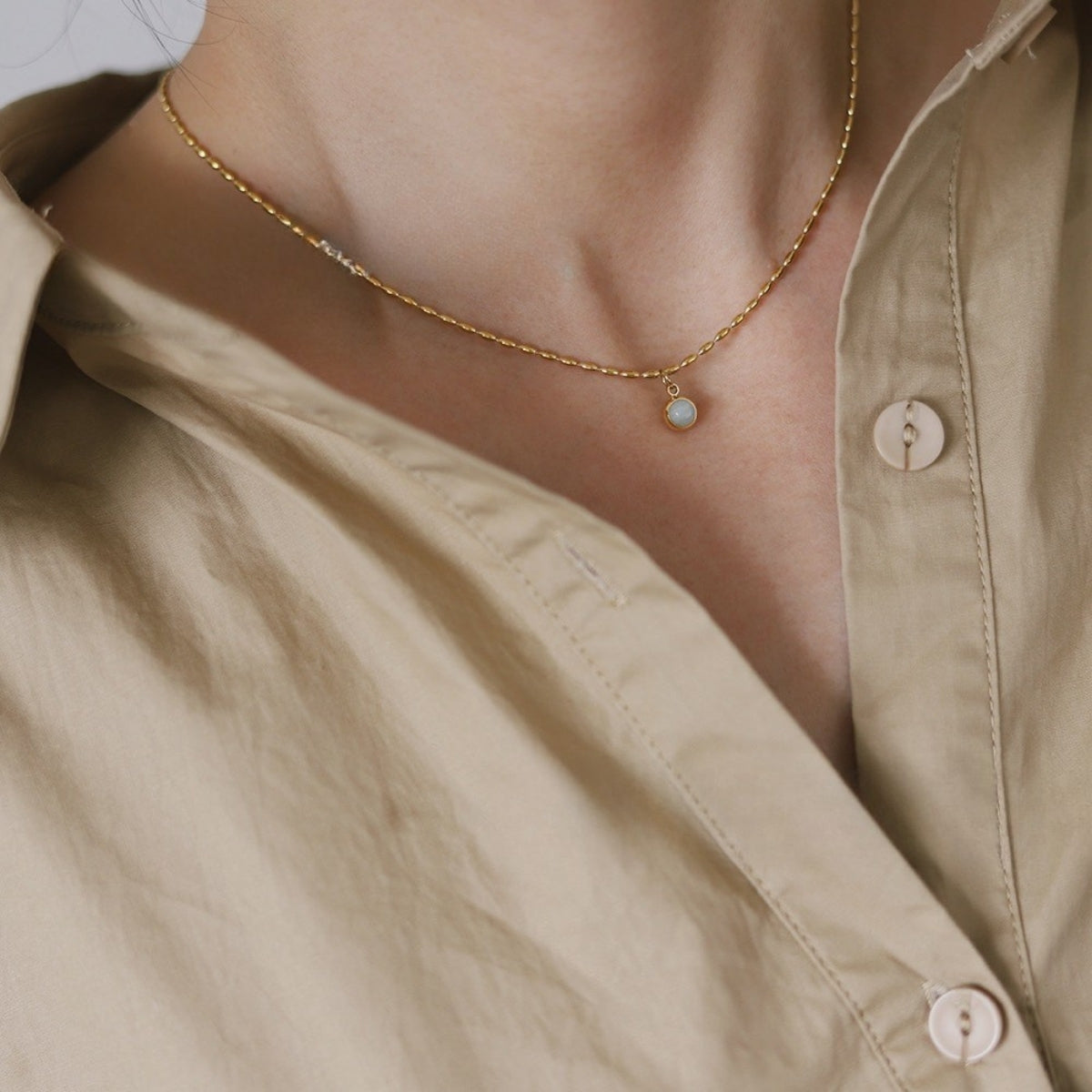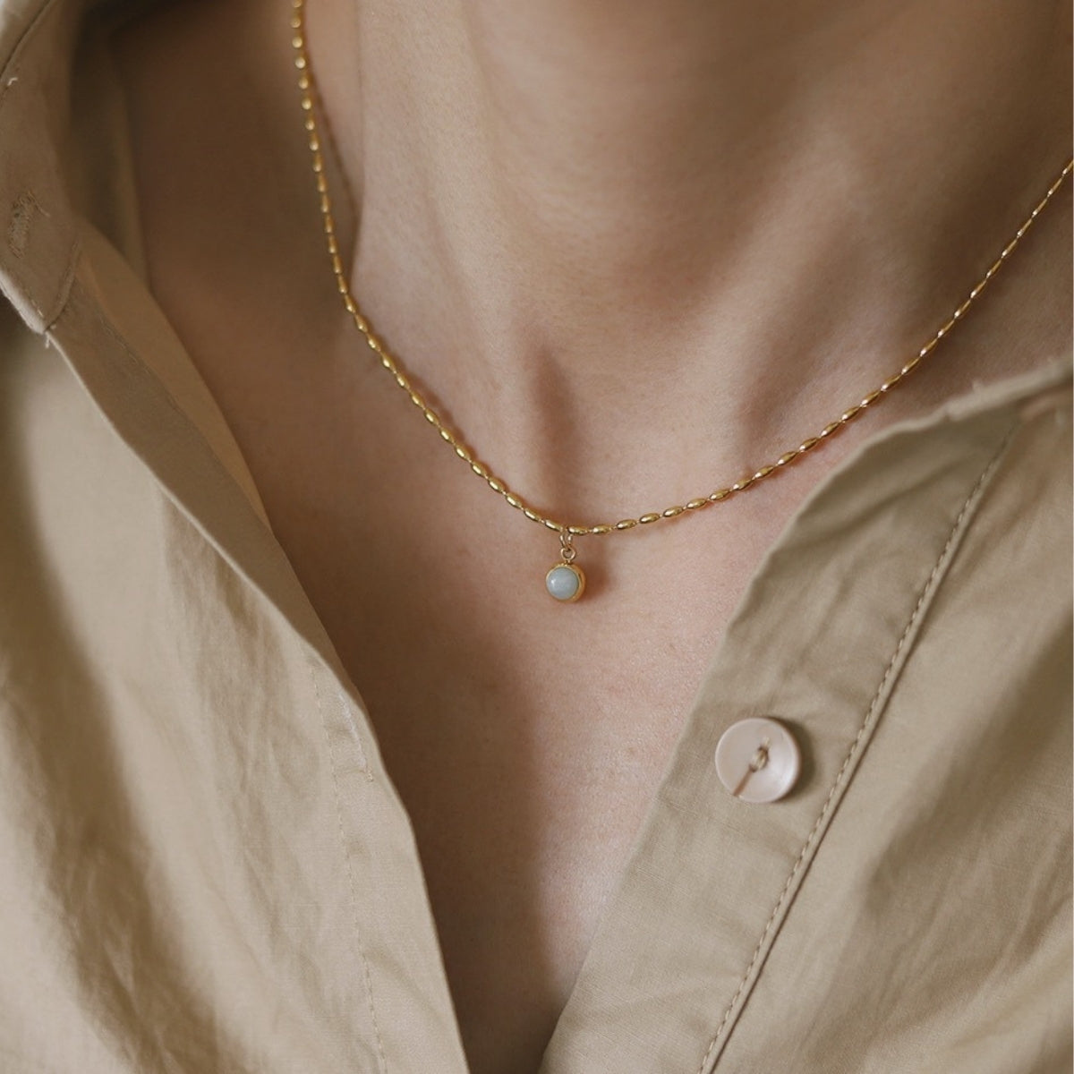 White Shell Round Pendant Design: Showcases a smooth round white shell pendant that radiates natural charm and seaside sophistication, ideal for effortless everyday styling.