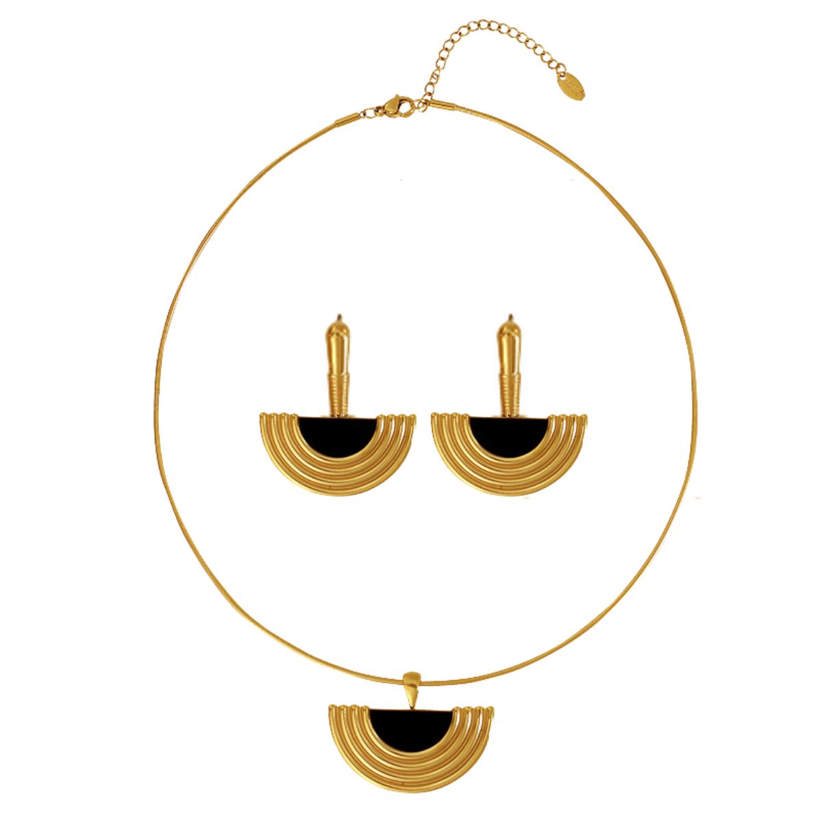 Make a striking style statement with this 18K gold-plated black semi-circle pendant and earrings set. Featuring a bold black enamel finish and a chunky semi-circle silhouette, this set blends standout design with everyday versatility. Waterproof and anti-tarnish plating ensures lasting shine from casual days to glamorous evenings.