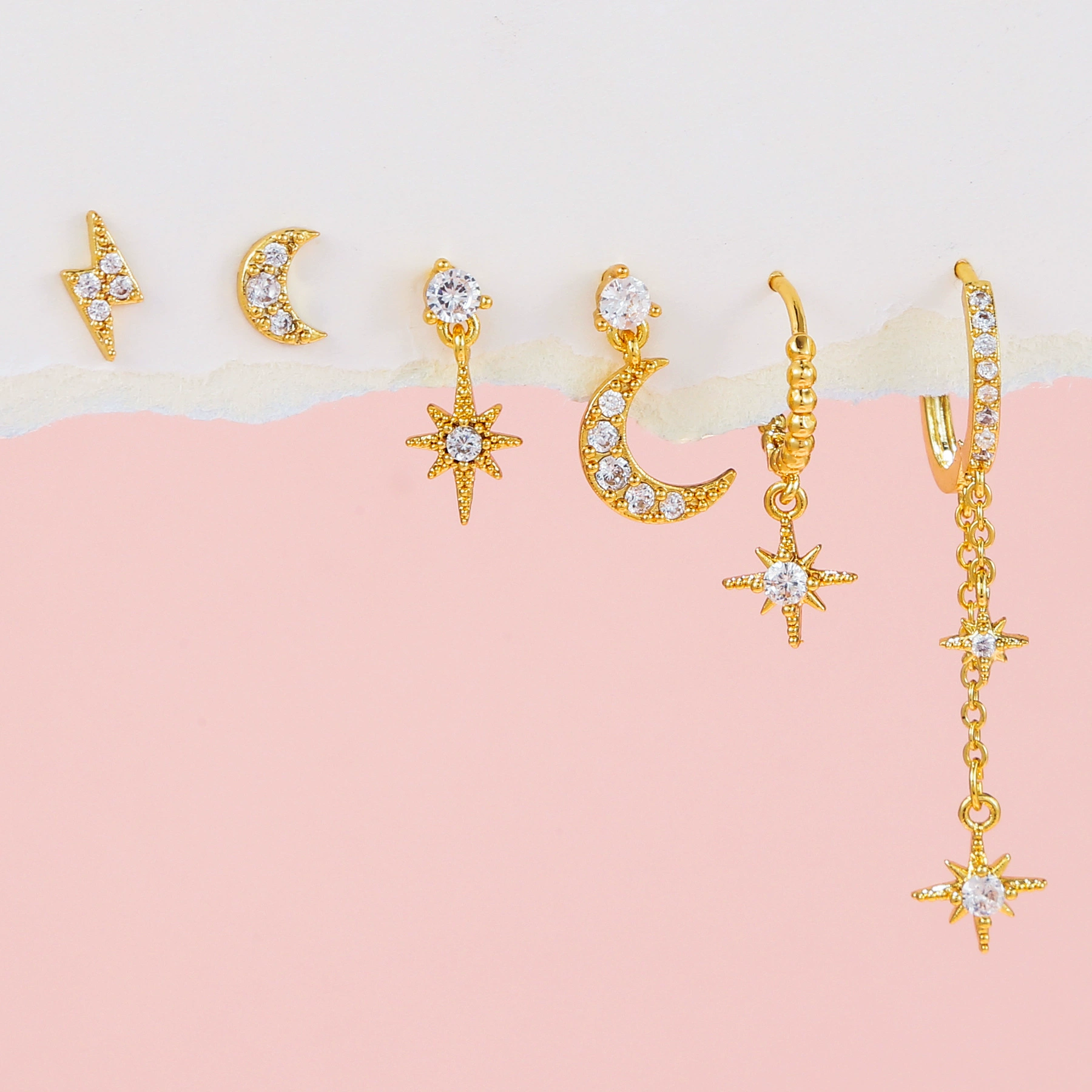 Mystical, radiant, and made for the stars — Nyxia Star Earring Set for SINGLE EAR ONLY is a 6-piece ear stack inspired by cosmic dreams. From twinkling stars to crescent moons and lightning bolts, each piece is crafted in 18K gold plating and adorned with luminous zircon stones. Wear them your way — bold and layered, or softly scattered. With Nyxia, the night sky isn’t above you — it’s on you.
