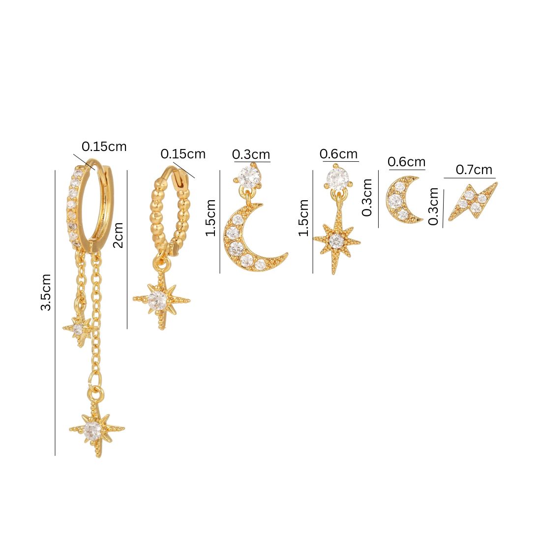 - Earring 1 length: 3.5cm, 2: length: 2cm3: length: 1.5cm4: length: 1.5cm5: length: 0.3cm6: length: 0.3cm